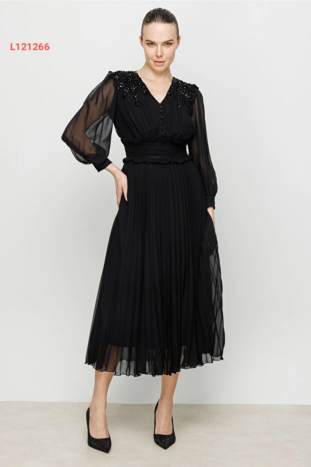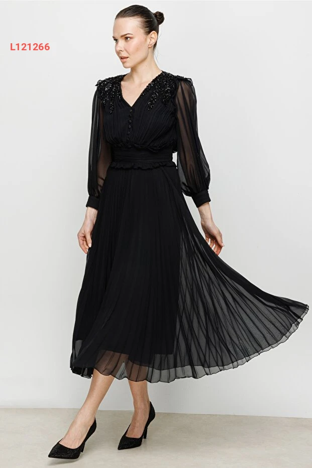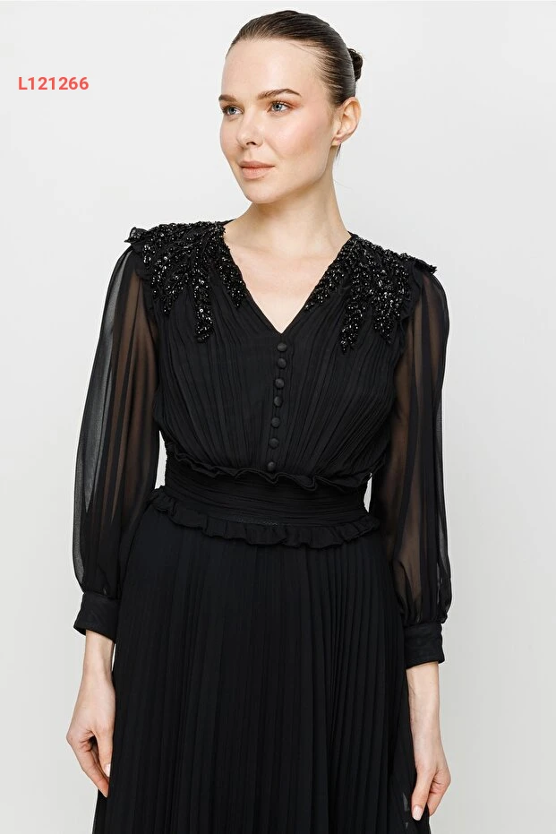 تألقي بأناقة لا تضاهى مع فستان نيفيلي المزين بالأحجار الراقية! يتميز هذا الفستان بتصميمه المتمايل وقصته الفريدة التي تعكس أنوثتك، مما يجعله مثاليًا للمناسبات الخاصة أو السهرات. استمتعي بالراحة والجمال في كل خطوة مع تفاصيله المنحوتة بعناية وإطلالته العصرية الساحرة.