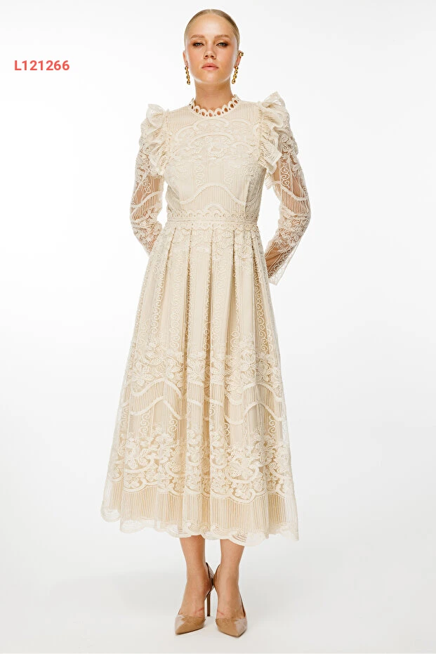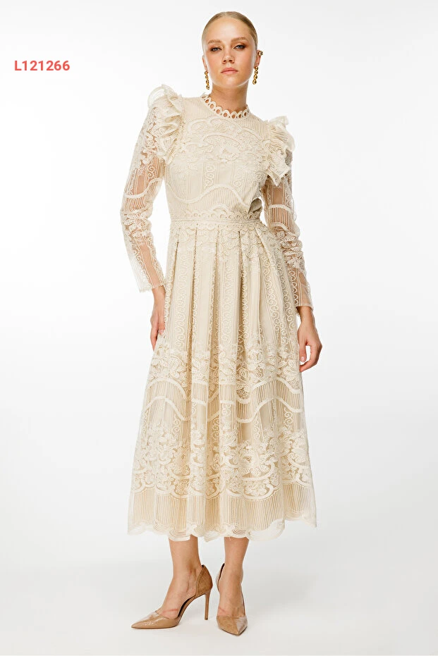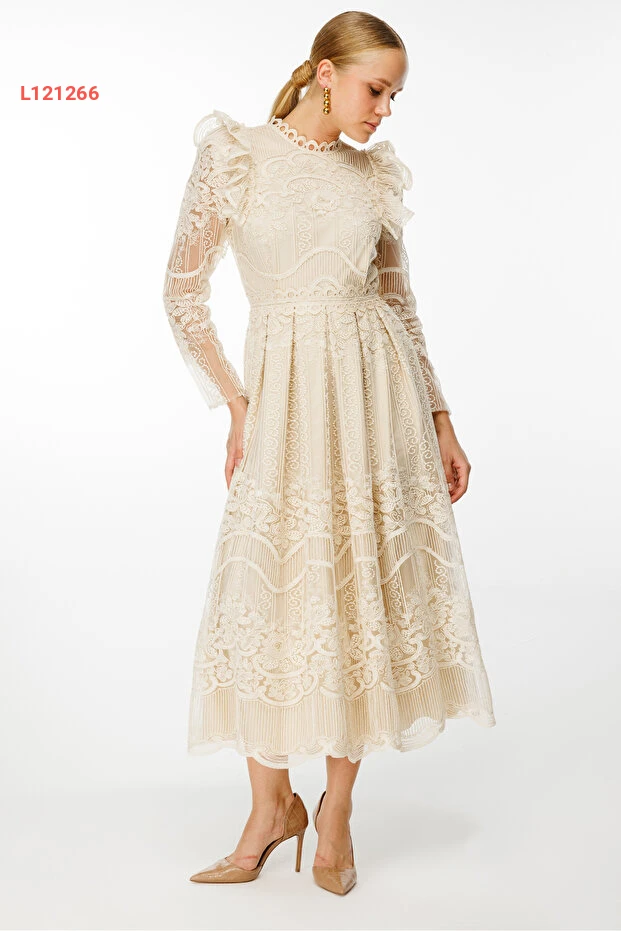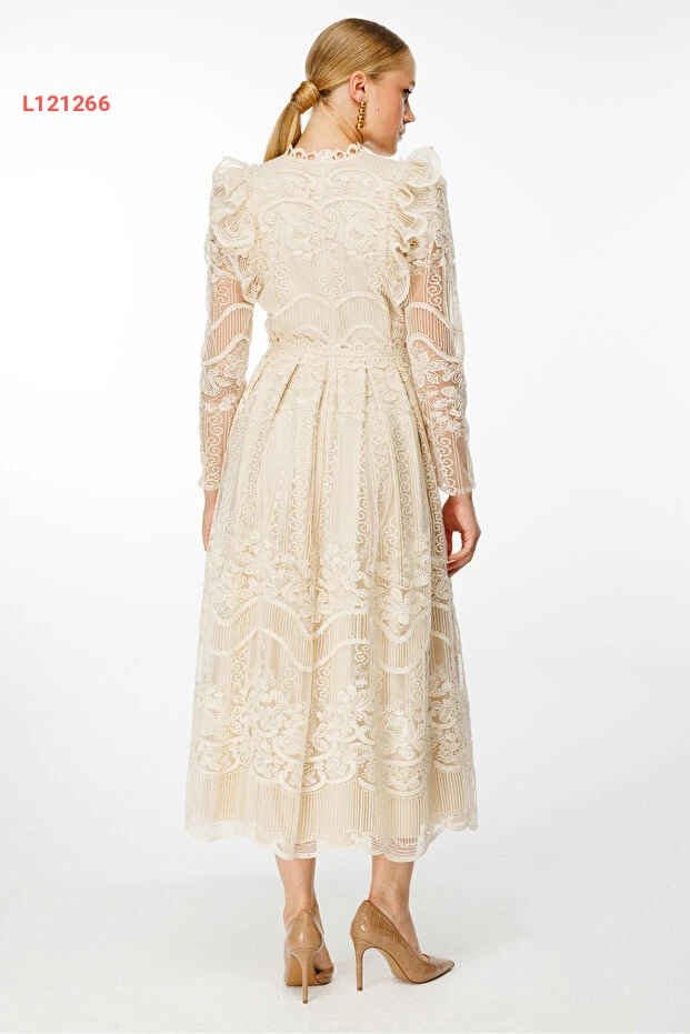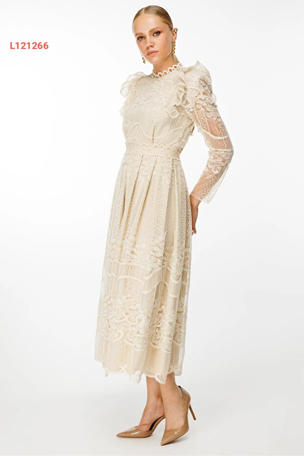 فستان ماكسي بأكمام طويلة وتفاصيل دانتيل مع حزام نيفيلي