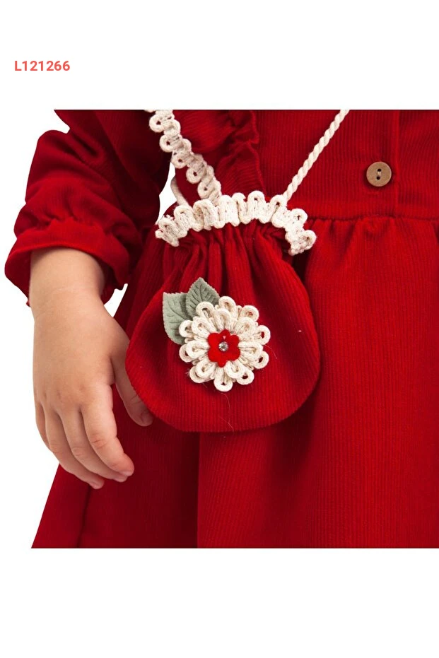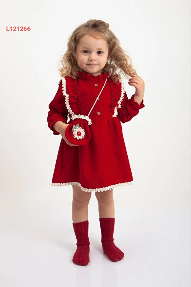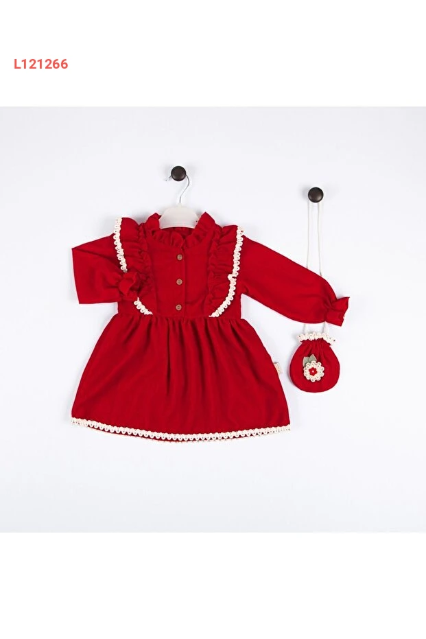 فستان صيفي طويل الأكمام مزين بالدانتيل مع حقيبة لطفلة - الأحمر (2-5 سنوات)