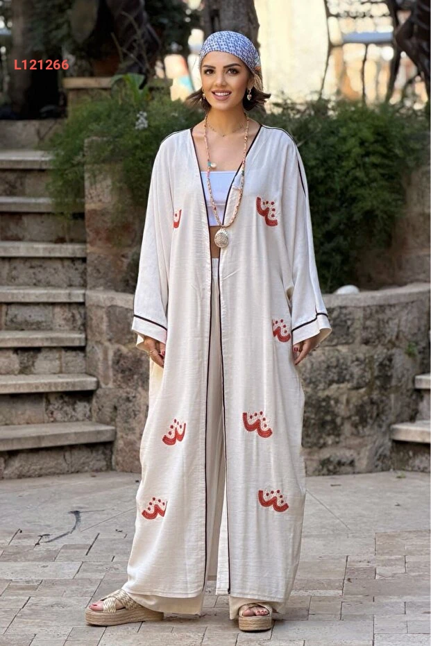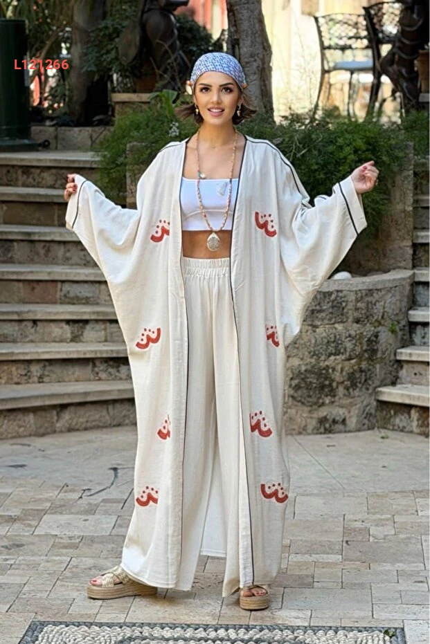 طقم كيمونو وبنطلون كتان مزين بتطريز برتقالي من نيفين كايا في لون الكريمي
