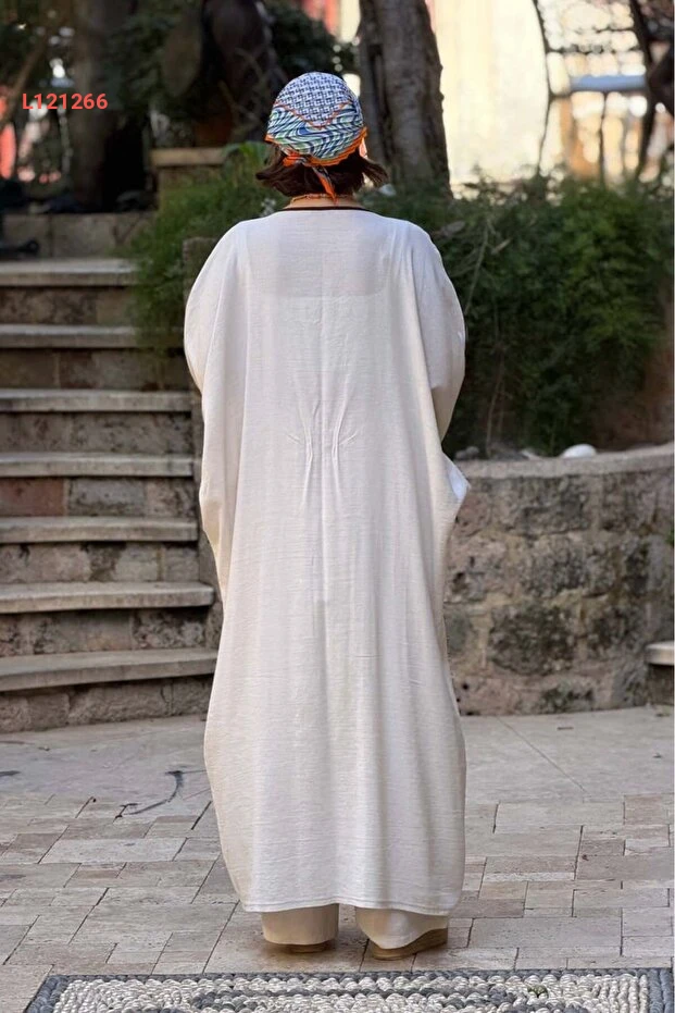 استمتع بأناقة لا تُضاهى مع مجموعة Nevin Kaya Moda المكونة من كيمونو وبنطلون بلون الكريمي المزخرف بخيوط برتقالية رائعة. تجمع هذه المجموعة بين الراحة والفخامة، لتعزز إطلالتك في كل مناسبة، سواء كانت سهرات أو لقاءات نهارية. اجعلي كل لحظة مميزة مع تصميمها العصري الذي يزيد من جمالك ويشعرك بالثقة.