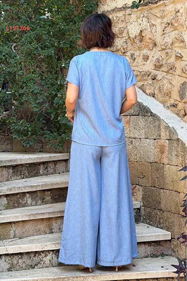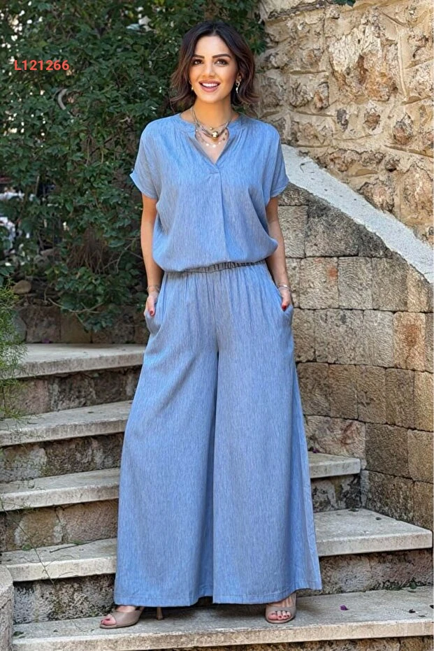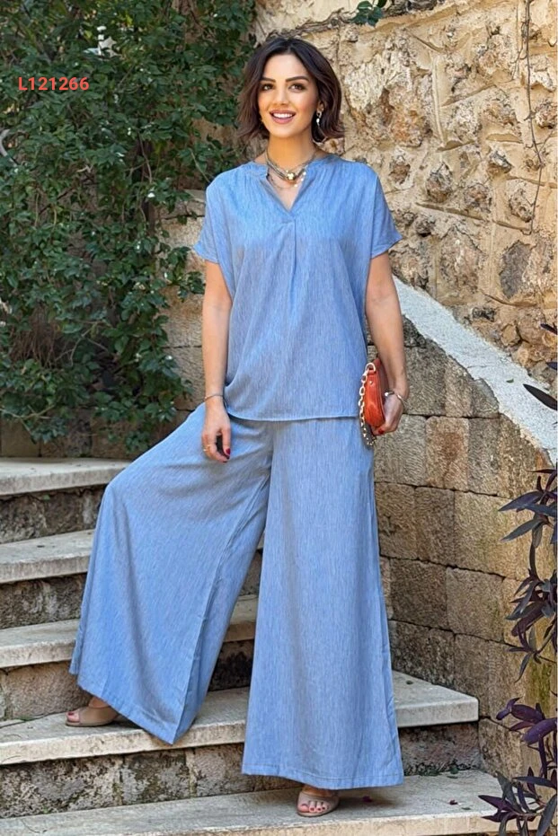 استمتعي بأناقة لا تضاهى مع طقم نيفين كايا المكون من بلوزة وبنطلون باللون الأزرق الفاتح. يتميز التصميم القصير بنفحات عصرية، بينما يوفر القماش الخفيف الراحة الكاملة في كل الأوقات. اختاري هذا الطقم المثالي لمظهر مميز يسهل تنسيقه في المناسبات اليومية والرسمية!