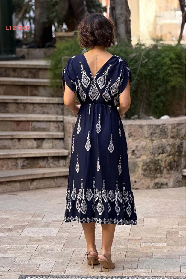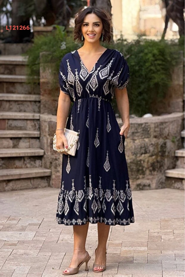 فستان نيفين كايا مودا V146 - أزرق داكن بنقشة إثنيّة مع كسرات