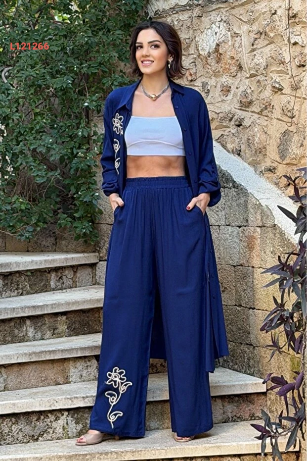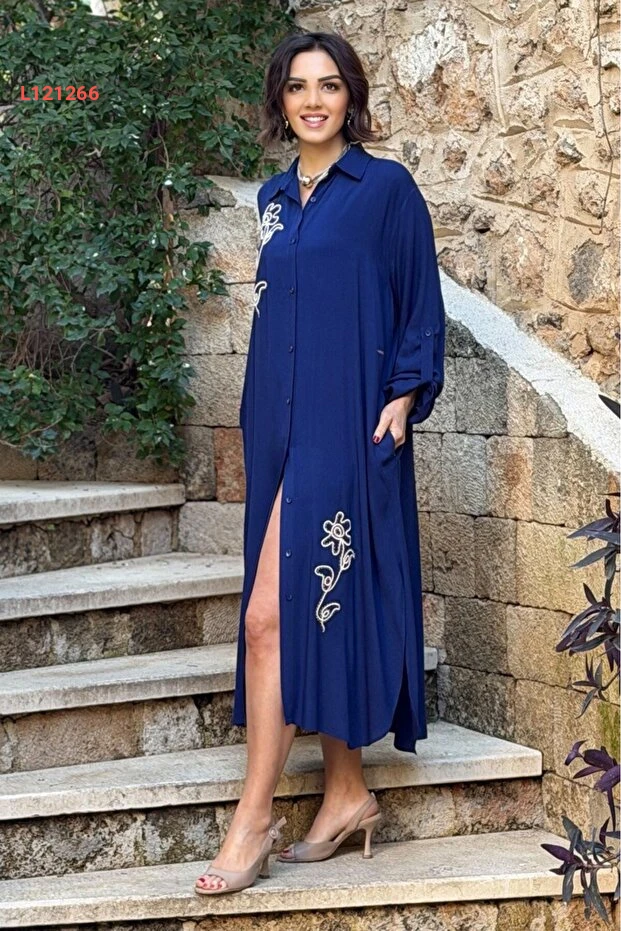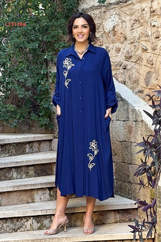 فستان وتي شيرت مزين بالتطريز الزهري من نيفين كايا - أزرق داكن