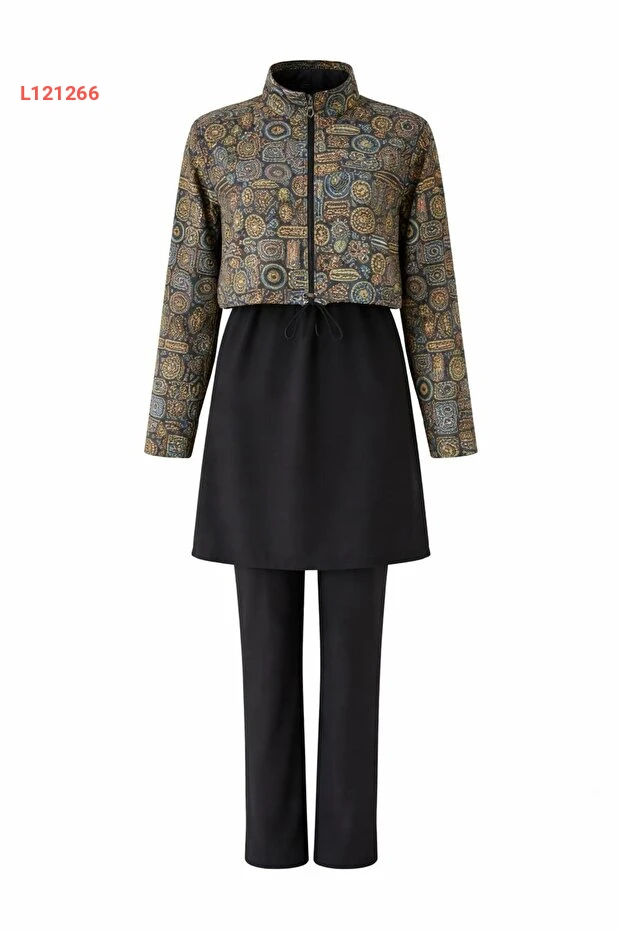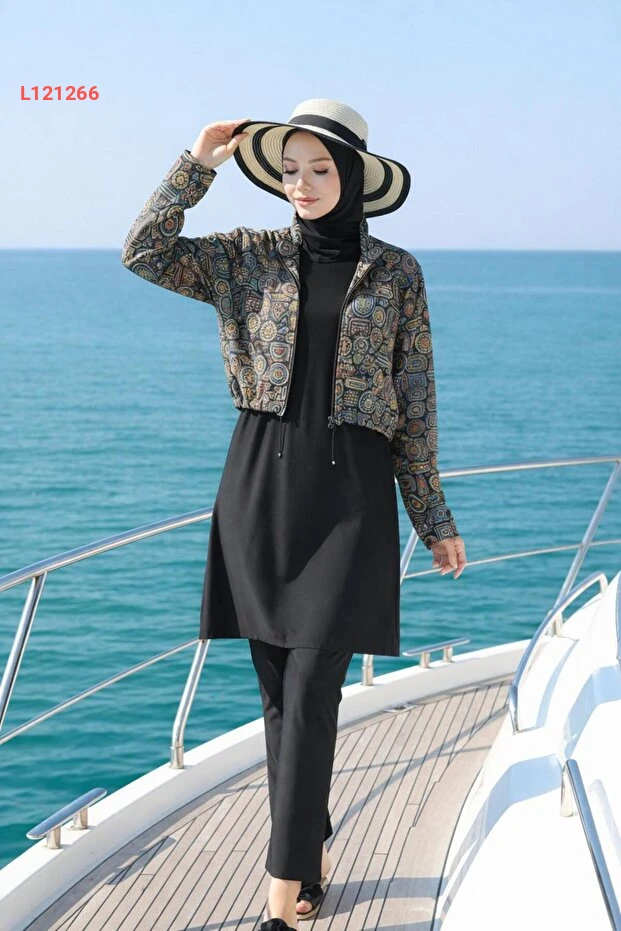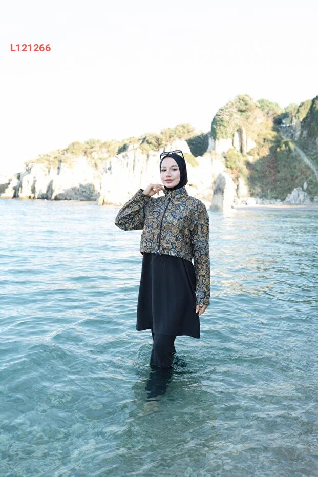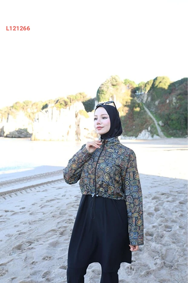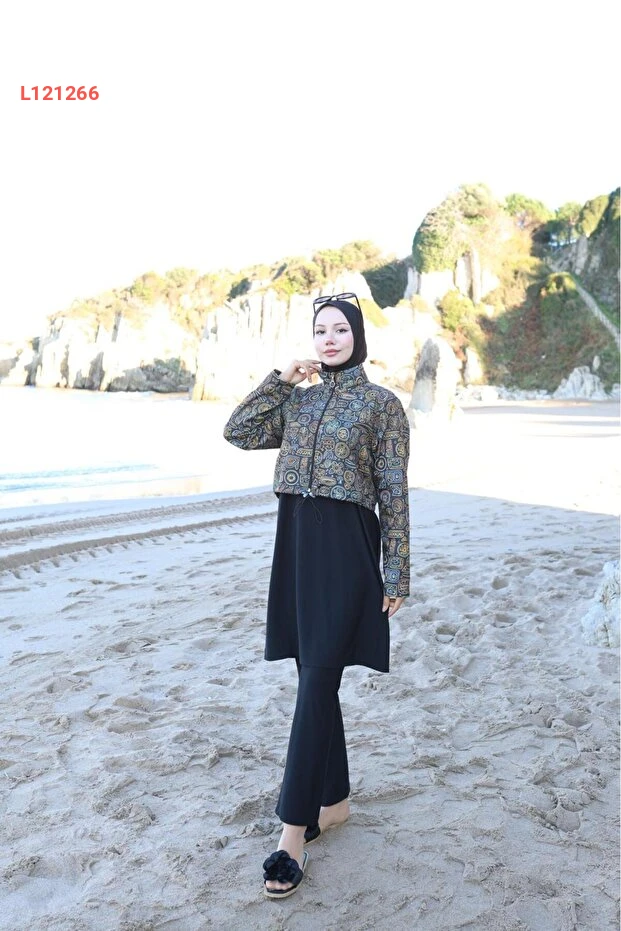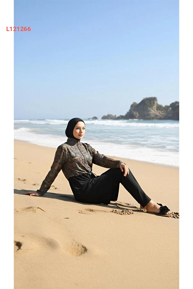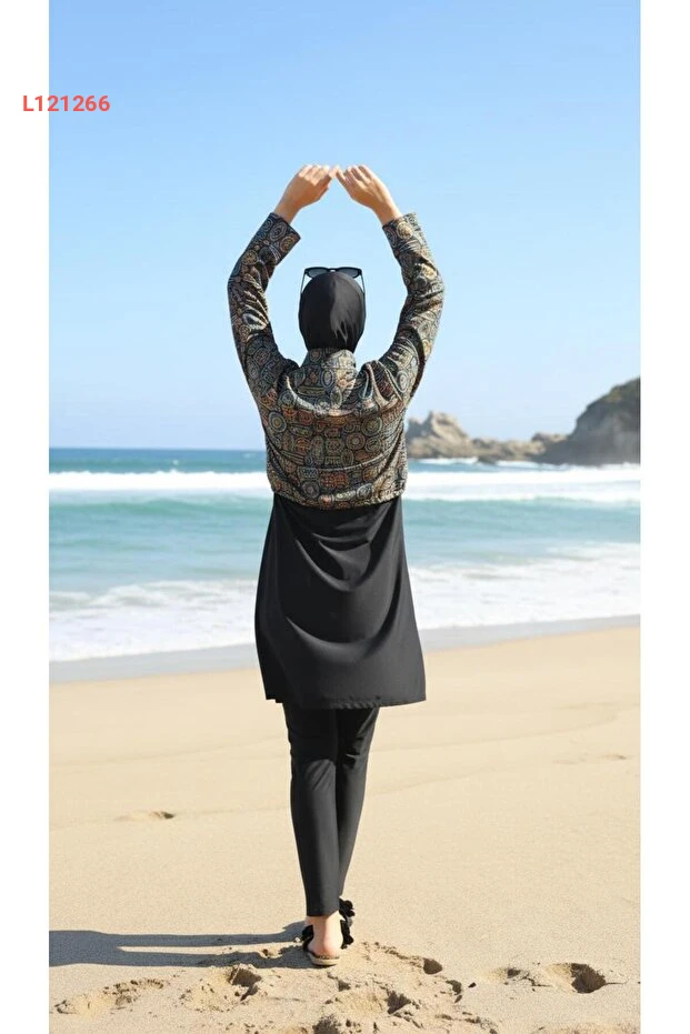 بدلة سباحة إسلامية نسائية بتصميم إثني مع غطاء رأس - مجموعة 4 قطع من رمال آتس