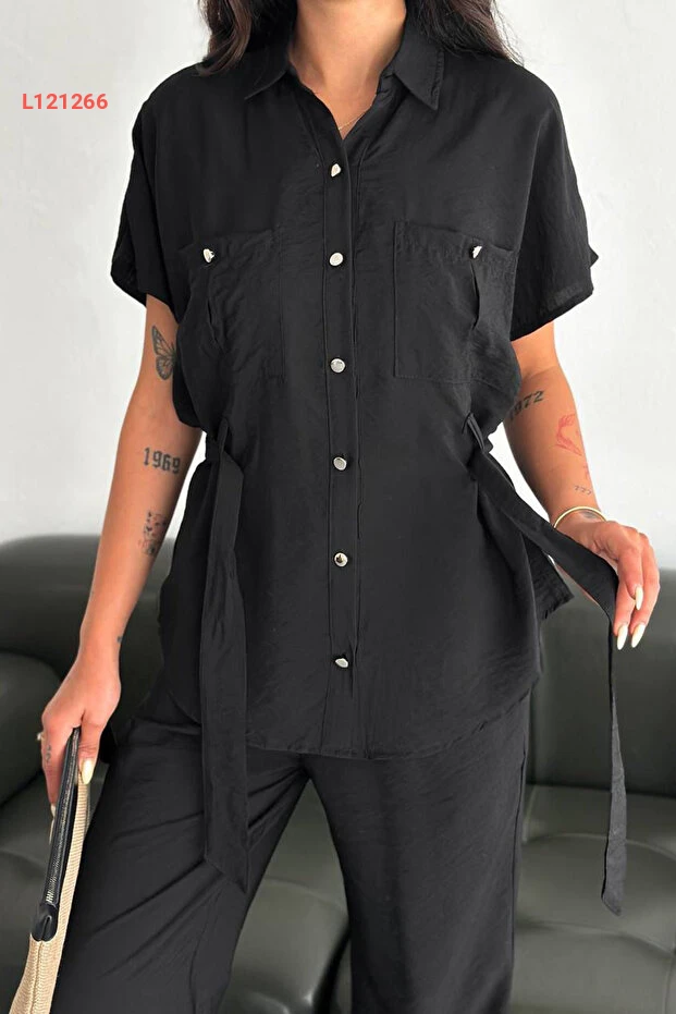 قميص قصير الأكمام مع تفاصيل حزام من نوى نوى – بيور-2083