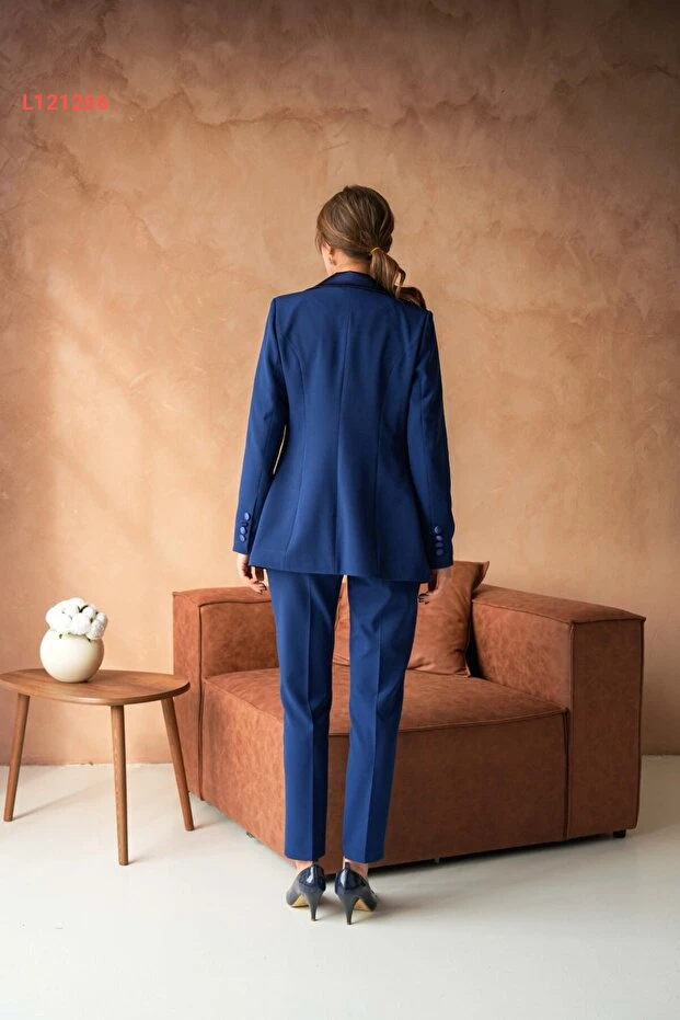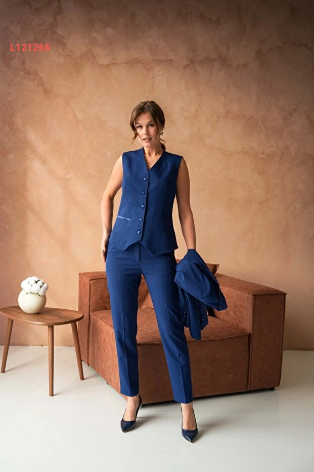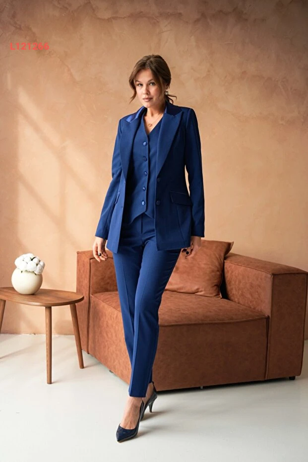 طقم نسائي ثلاثي مع سترة وزرّين - لون أزرق داكن