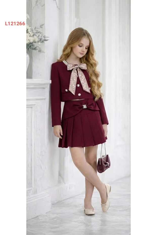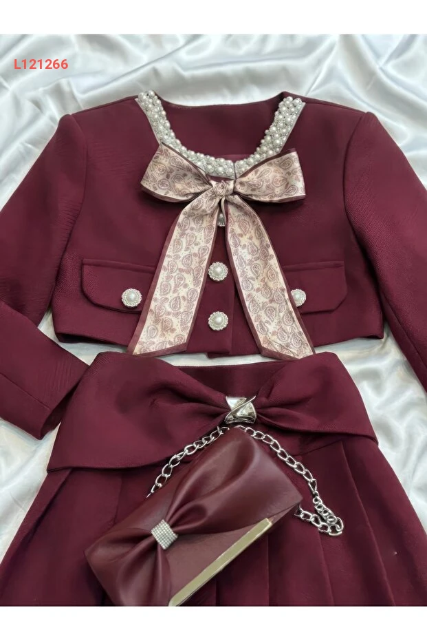 طقم فستان نورة الفاخر للبنات: جاكيت، تنورة، حجاب، وحقيبة بـ 4 قطع