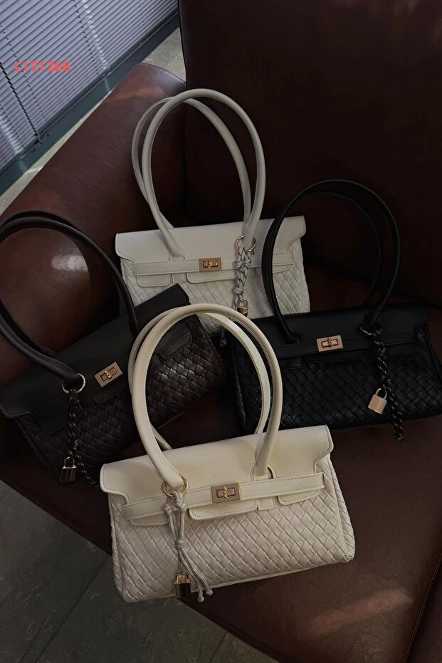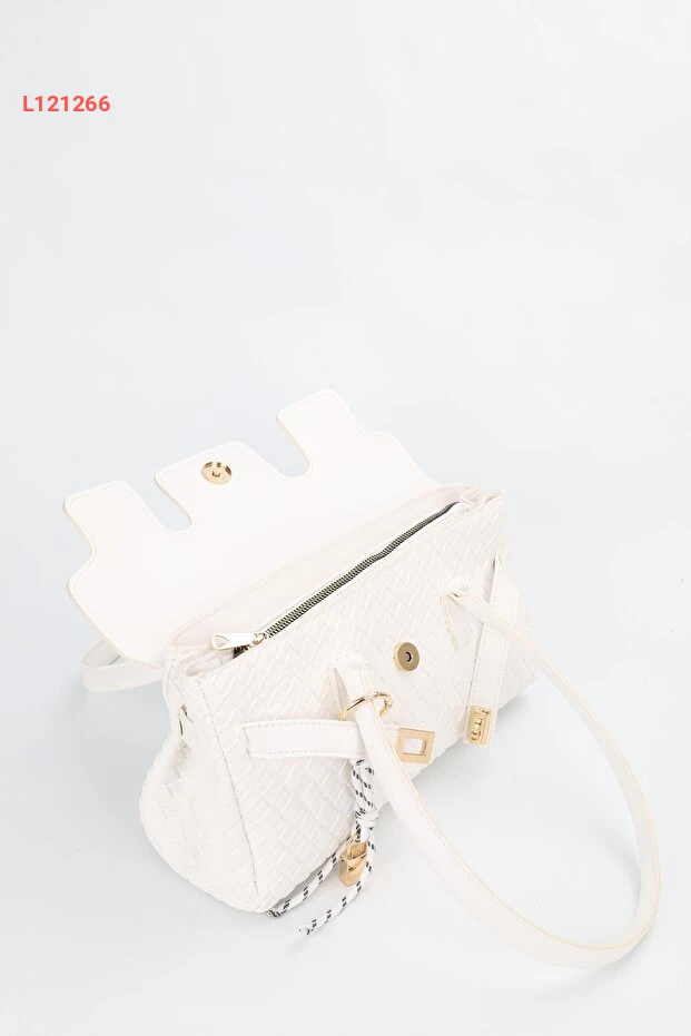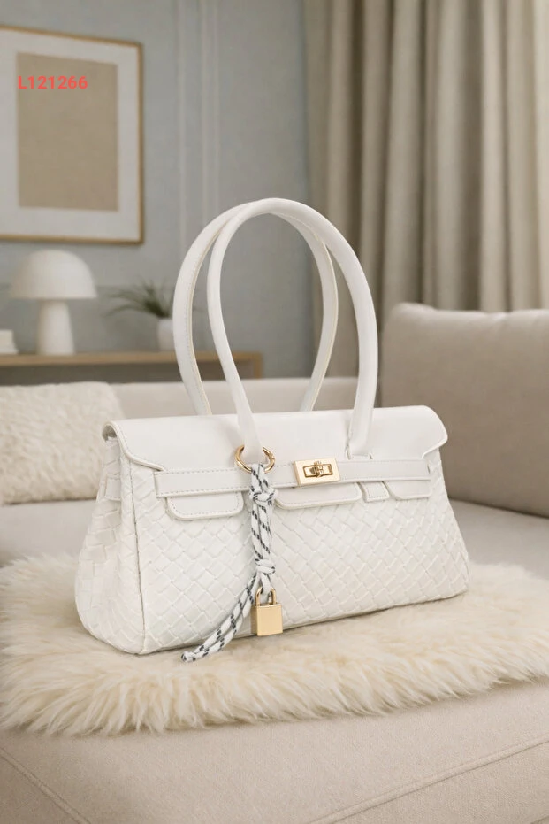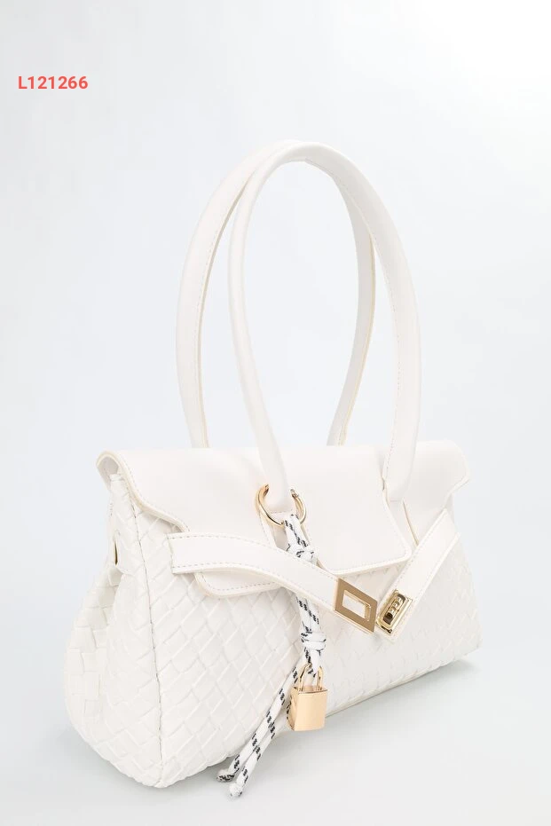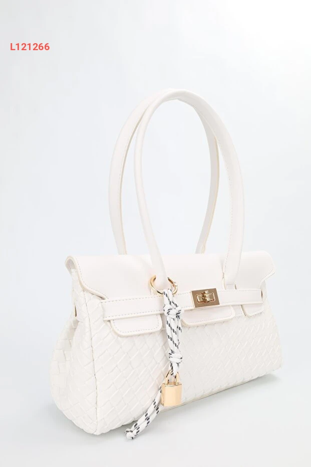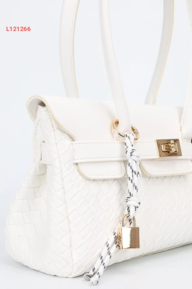 حقيبة يد وساعدين بغطاء مزودة بتفاصيل تشارم من جلد مضفر أبيض - بيرا