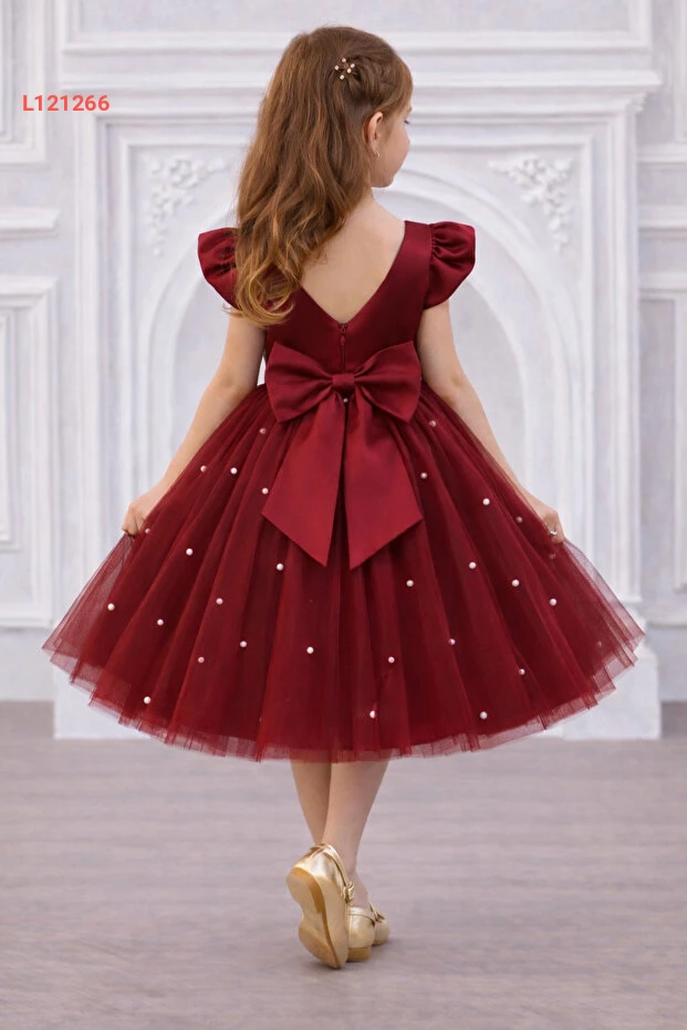 فستان حفلات تخرج للأطفال باللون الماروني مع تفاصيل فيونكة وخرز، فستان أميرة للحفلات والمناسبات