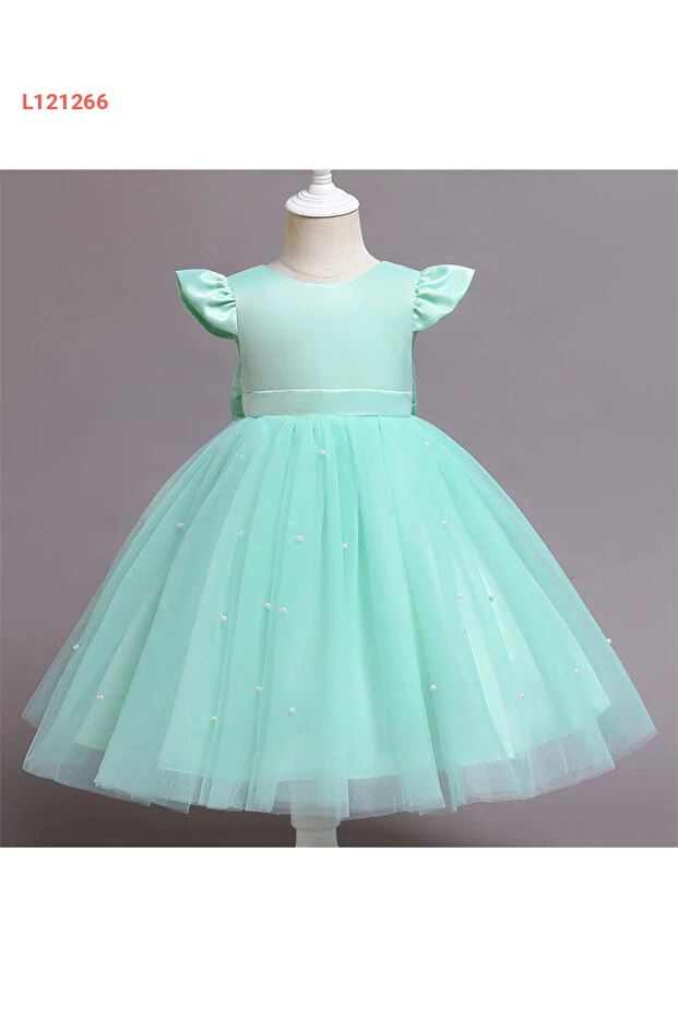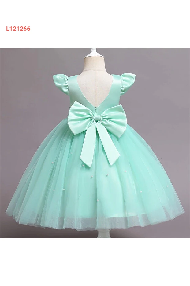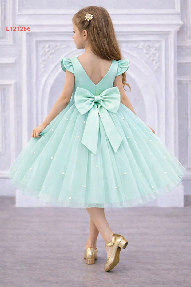 فستان عيد ميلاد أميرة بتفاصيل لؤلؤية وقوس، مزود بشريطة هدية باللون الأخضر النعناعي للأطفال البنات