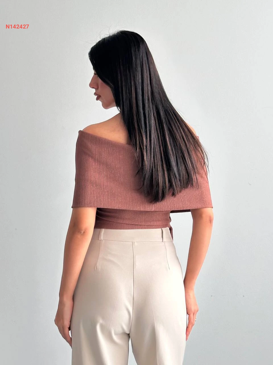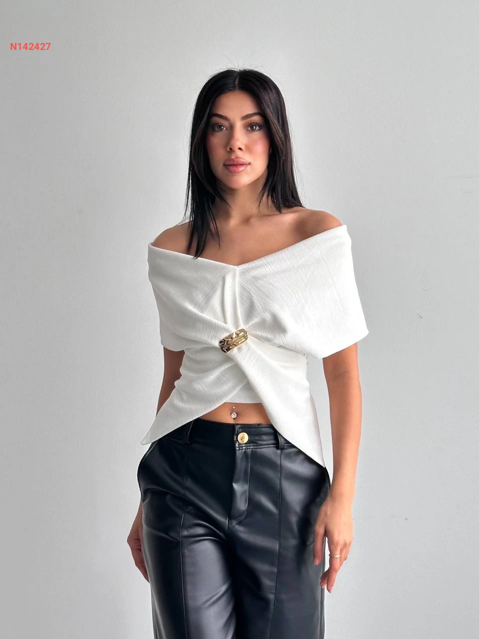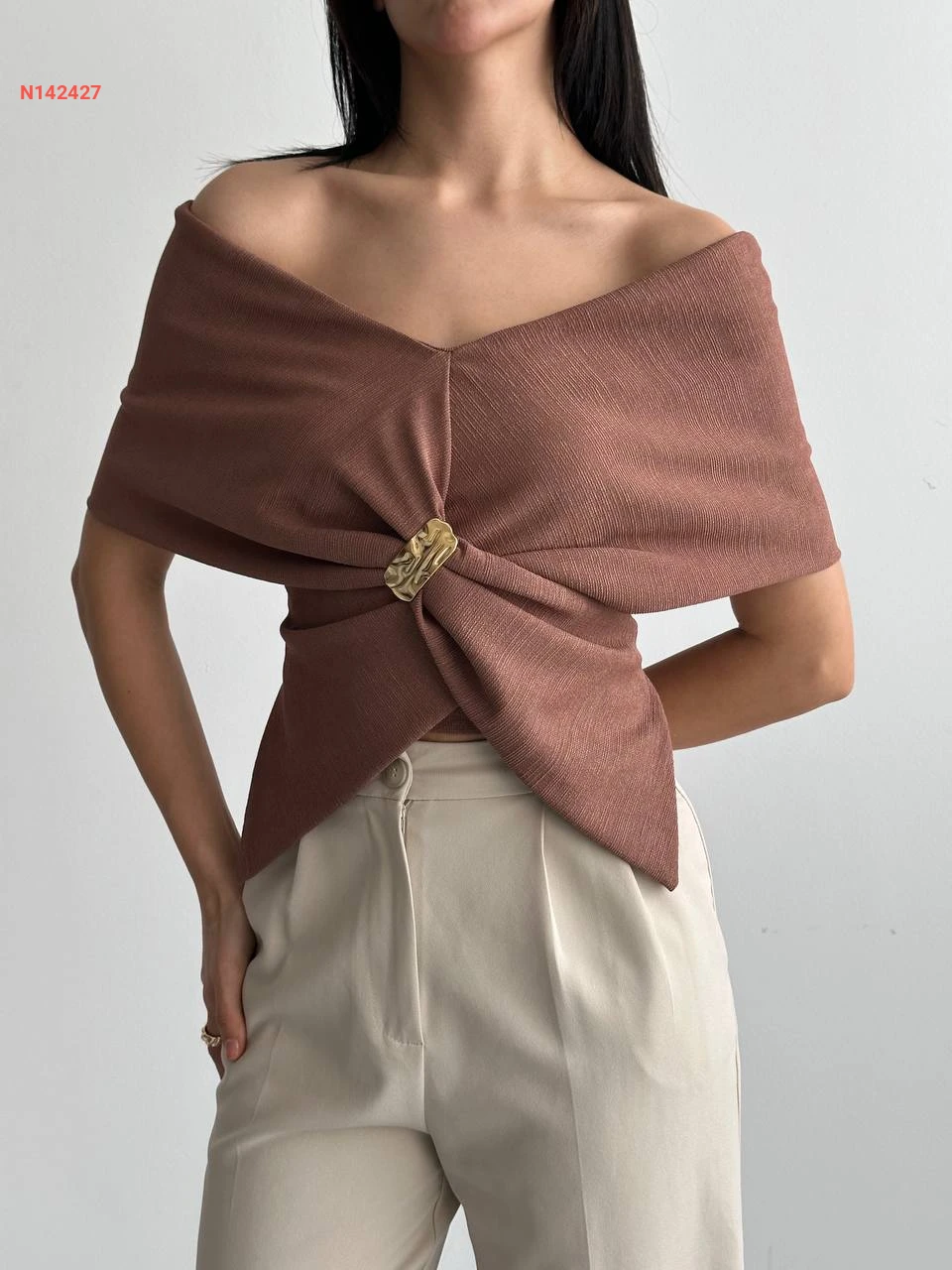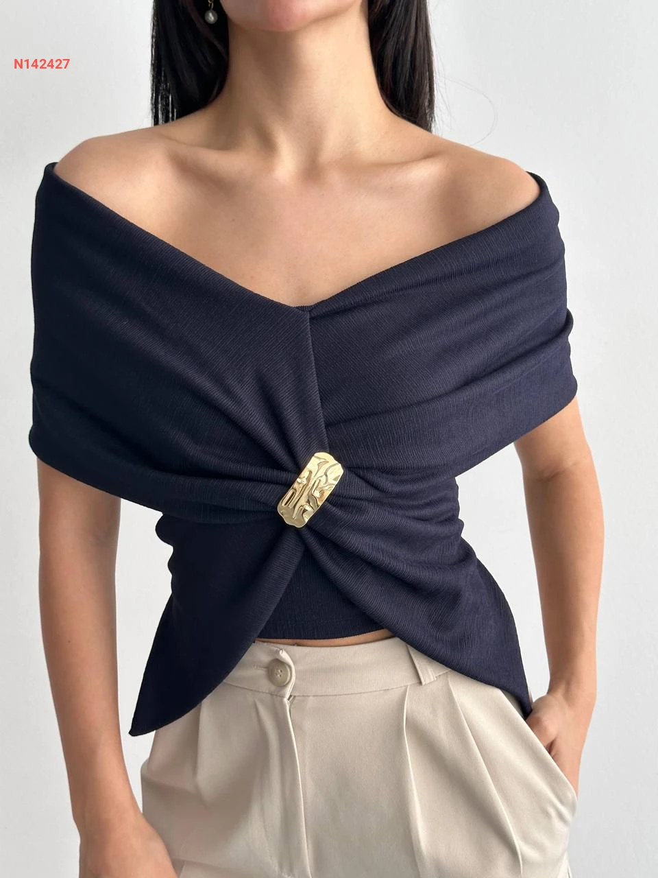 بلوزة مكشوفة الأكتاف ببروش دهبي