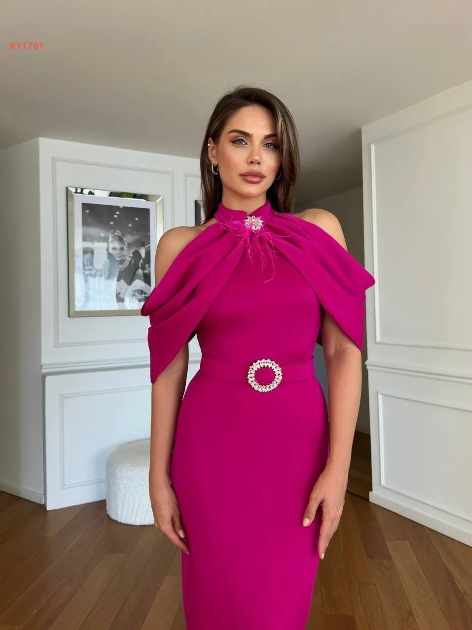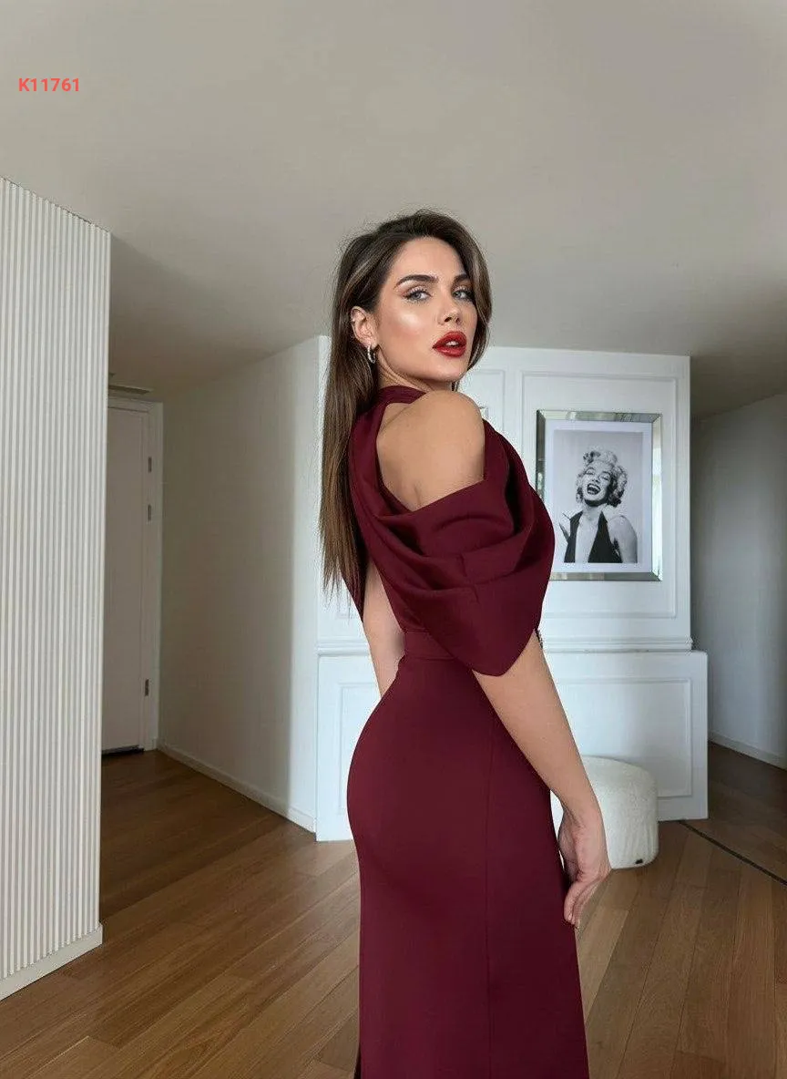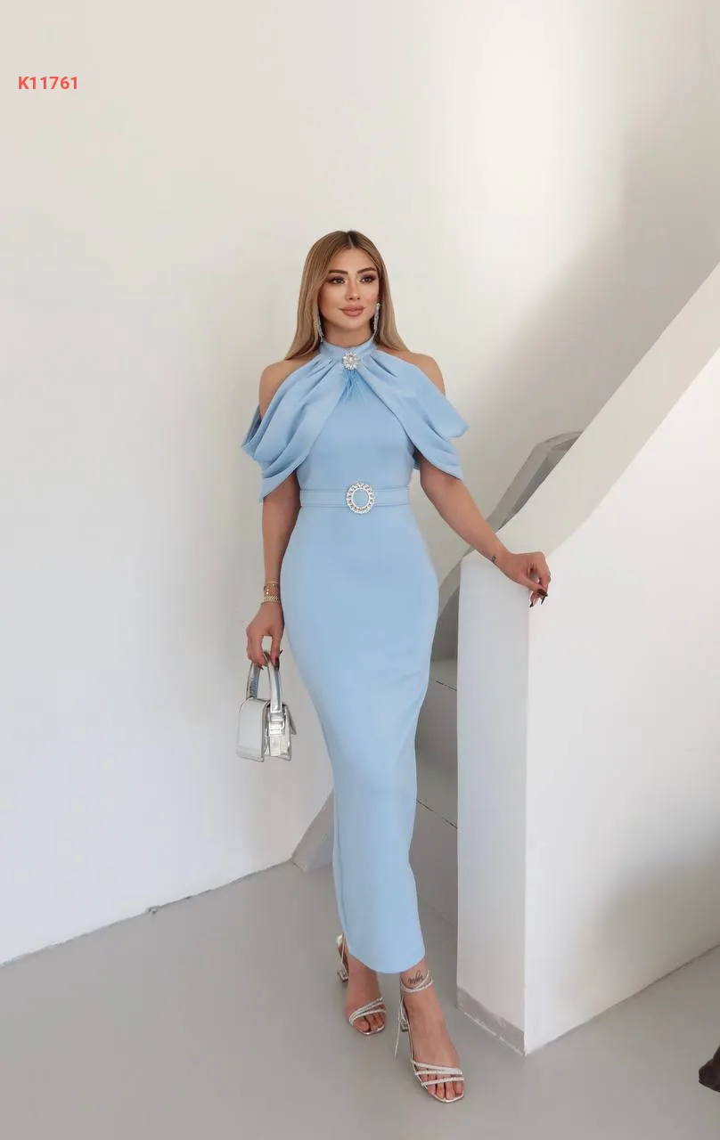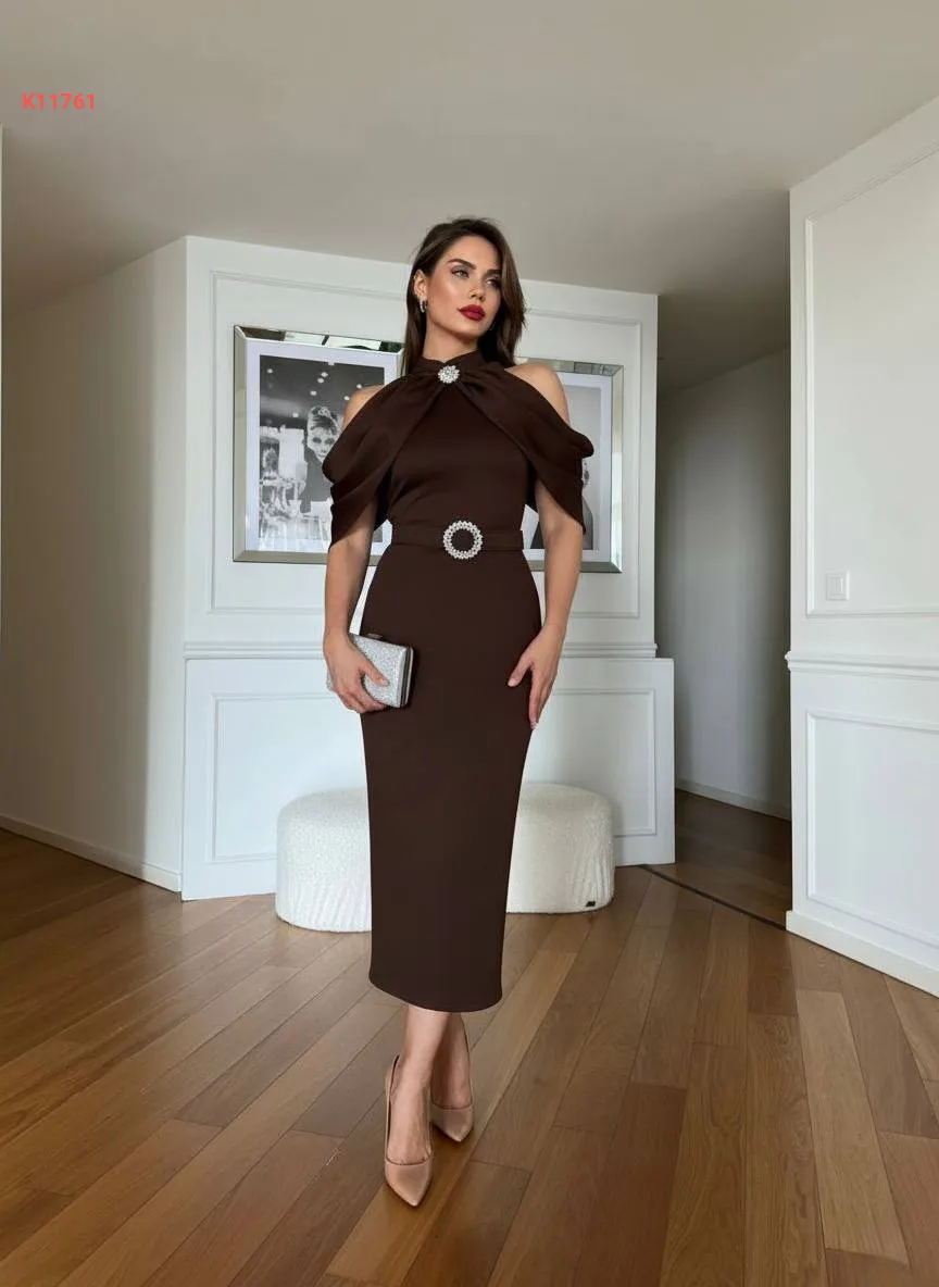فستان مكشوف الأكتاف ببروش كريستال