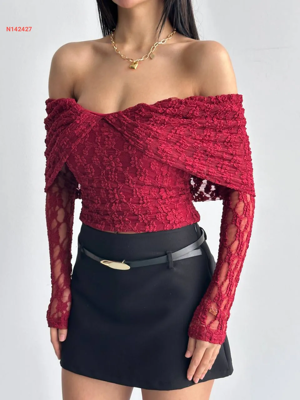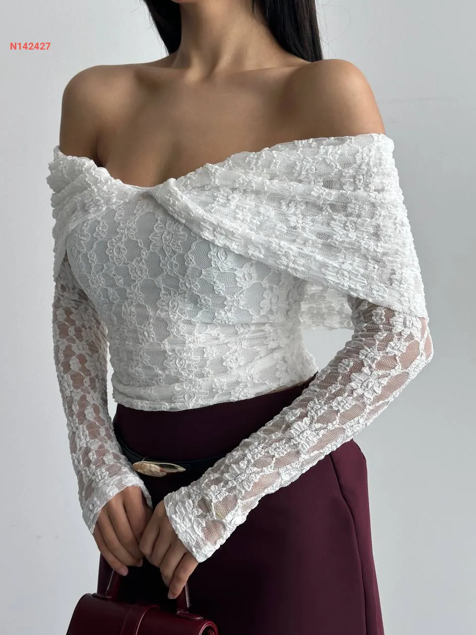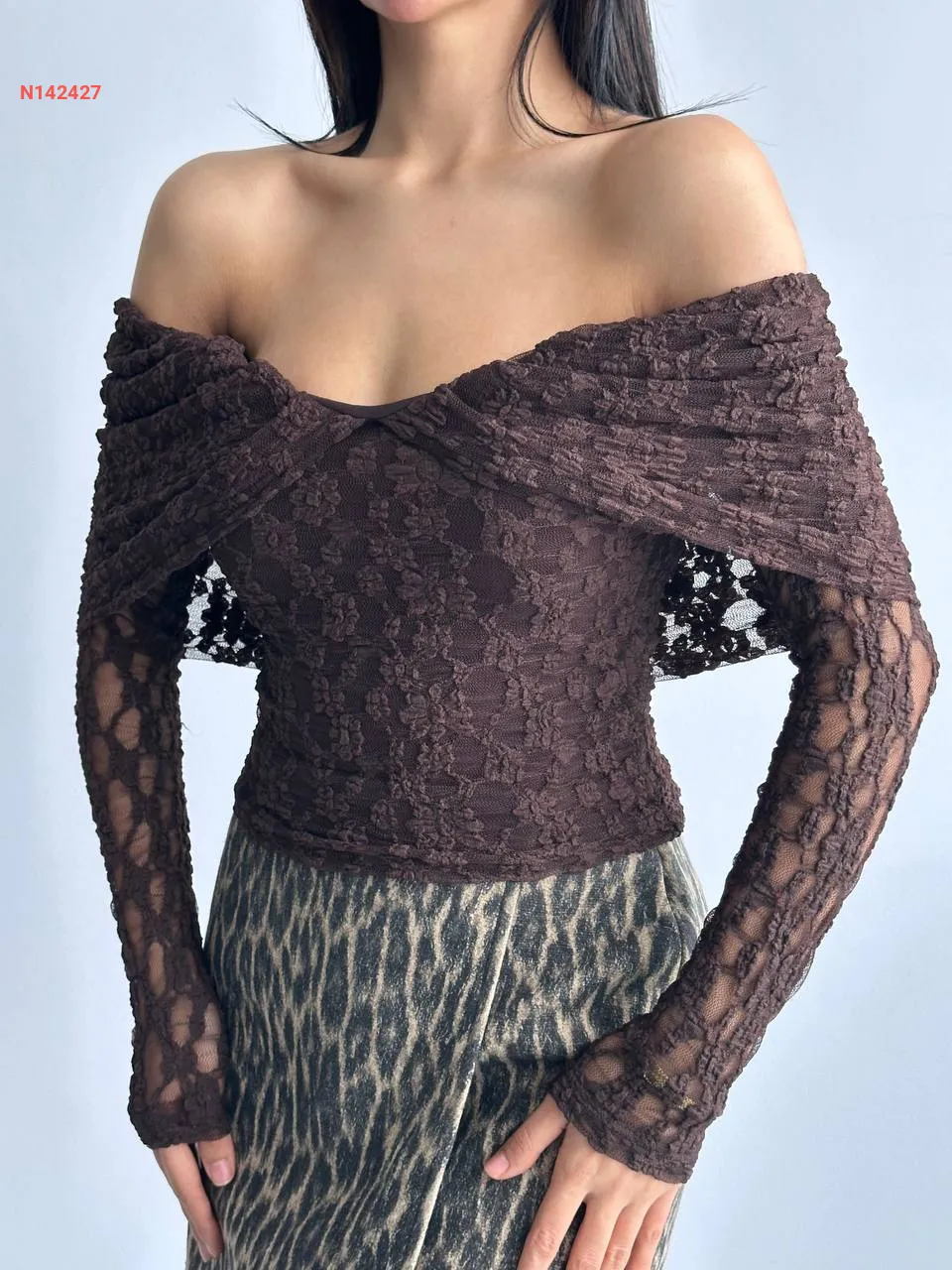 بلوزة تول منقوشة مكشوفة الأكتاف