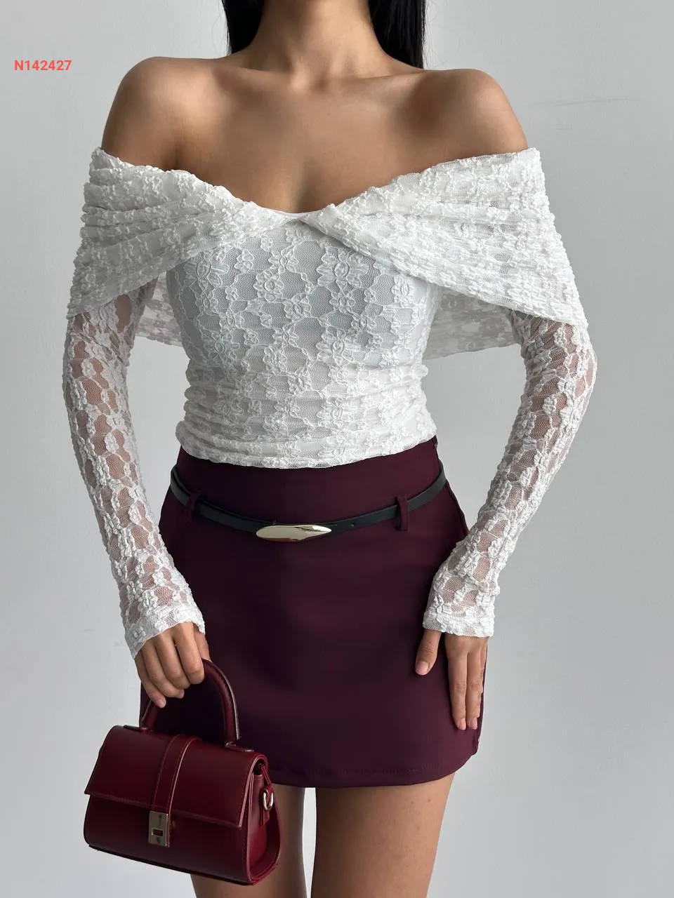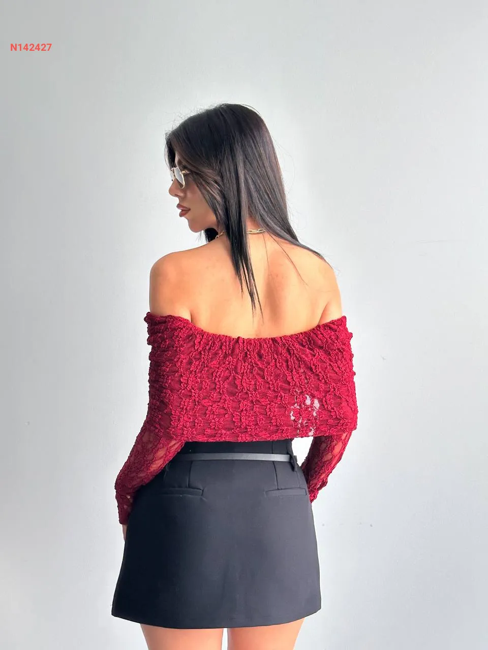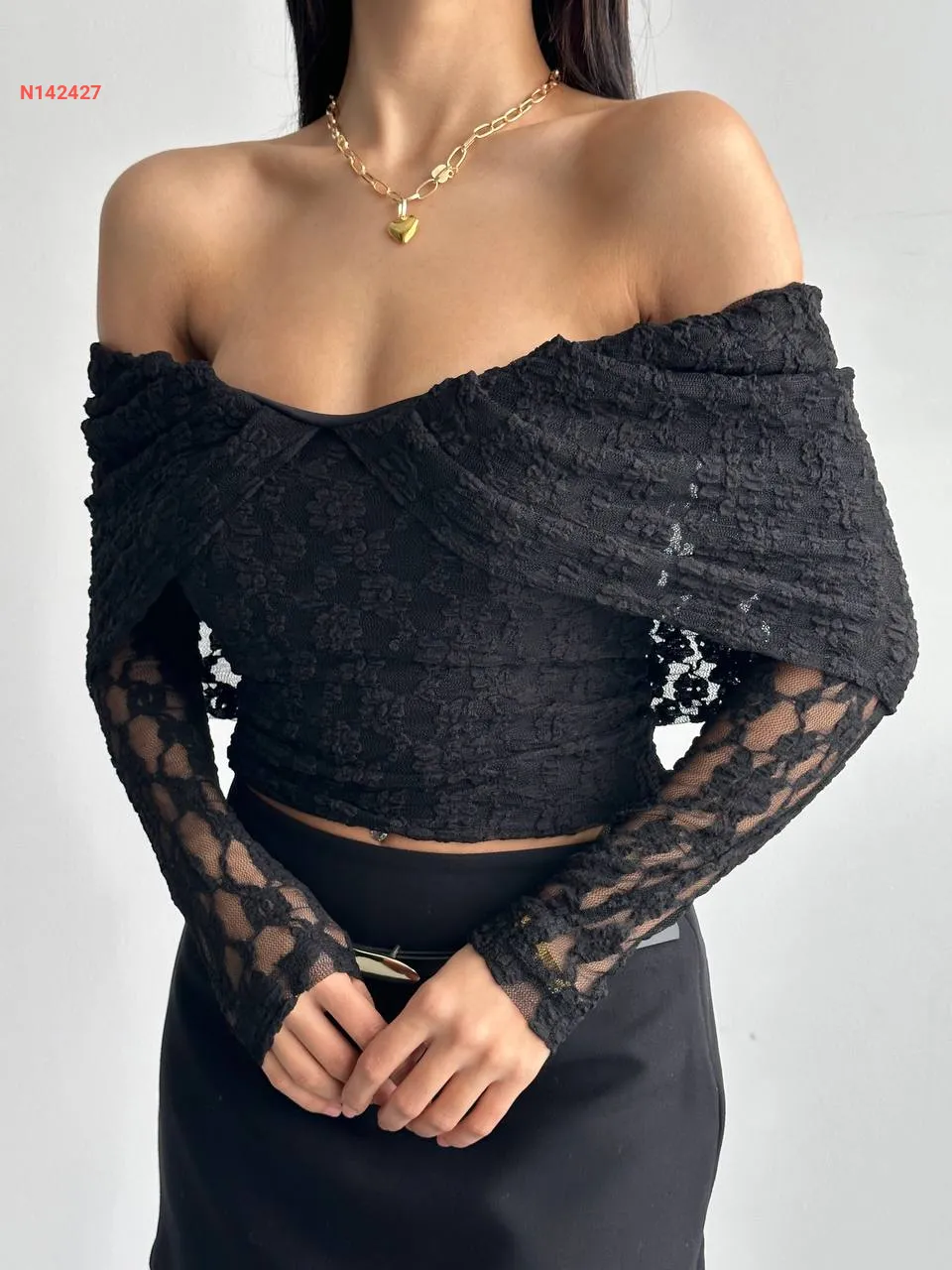 بلوزة تول منقوشة مكشوفة الأكتاف