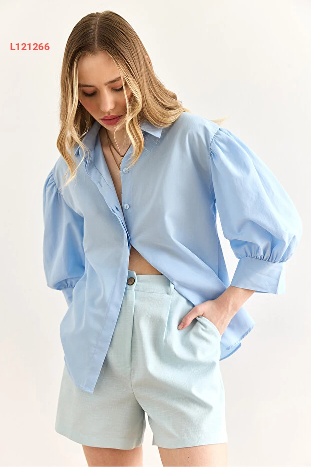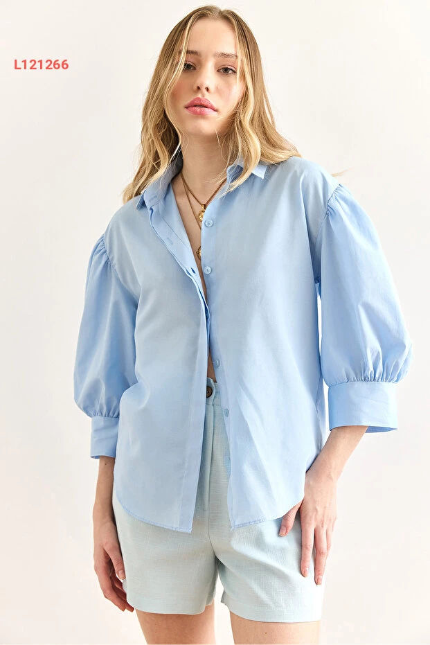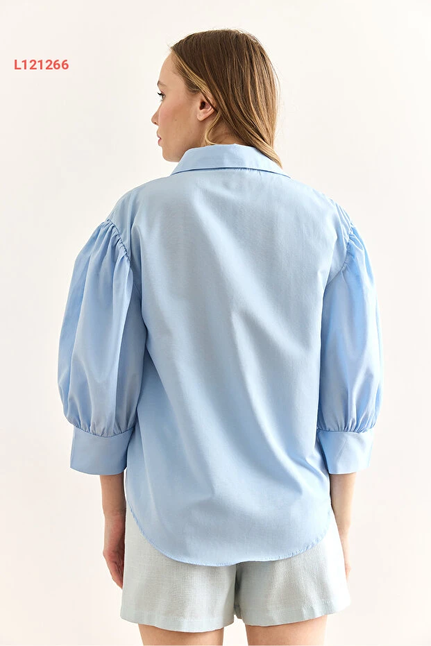 قميص نسائي أزرق بتصميم عصري مع أكمام بالون من قطن تيري