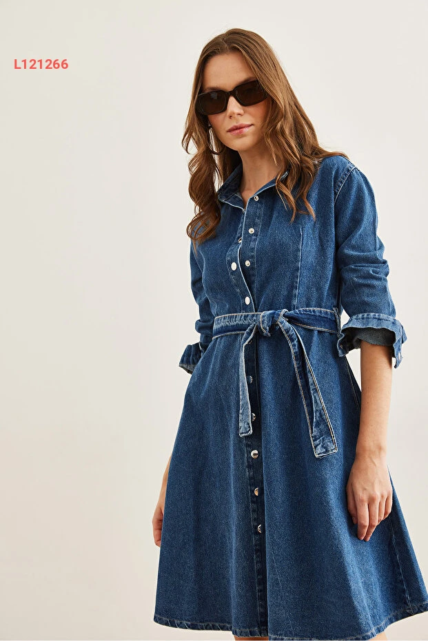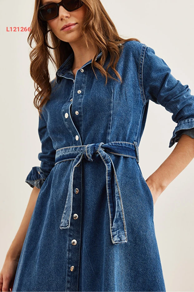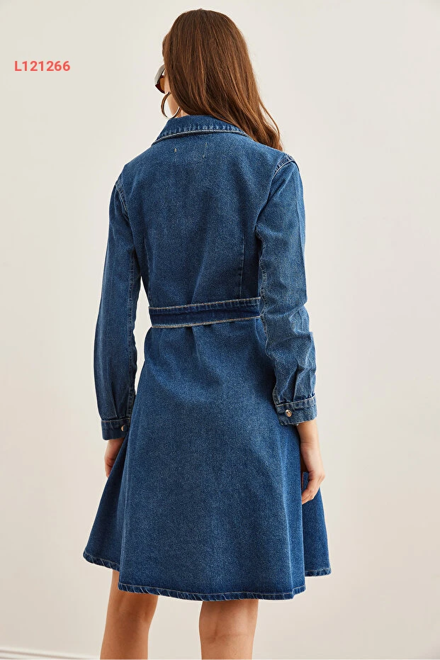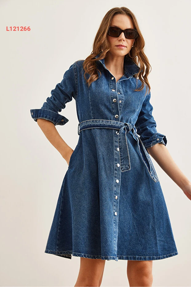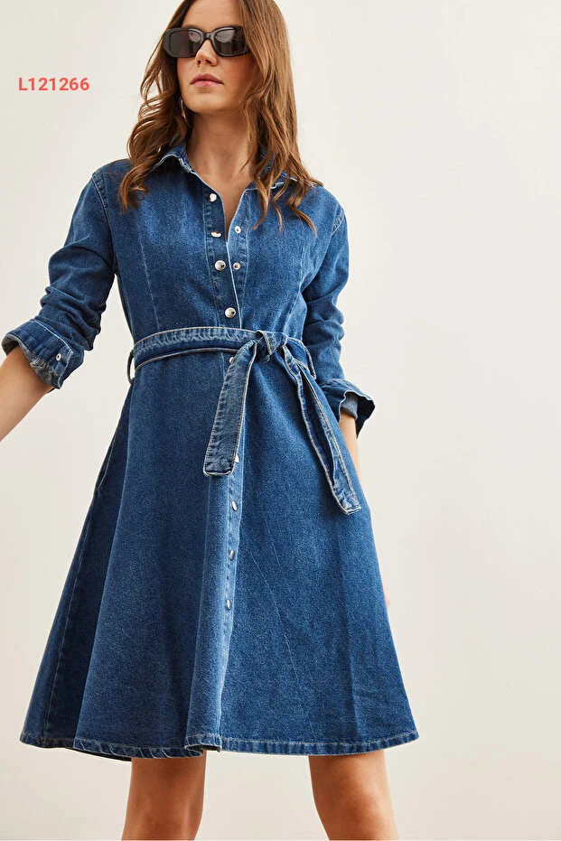 فستان دينم كلوش كحلي مزود بحزام و جيوب من أولالووك