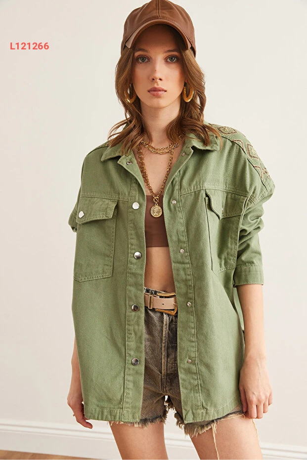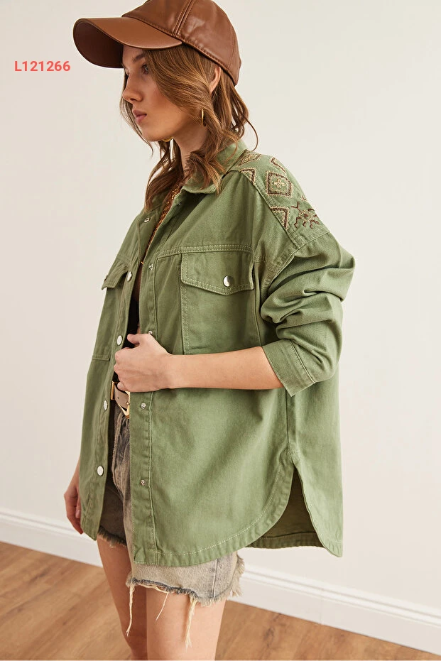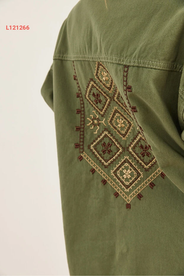 جاكيت نسائي بخامة قطنية مع تطريز على الأكتاف والظهر بلون الكاكي