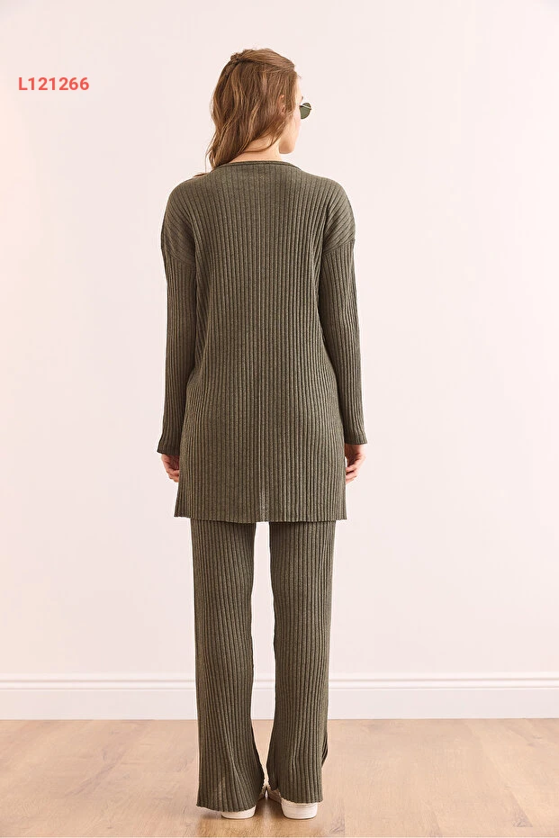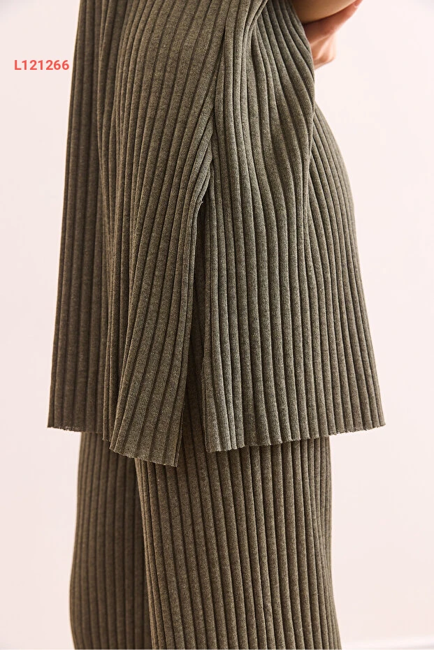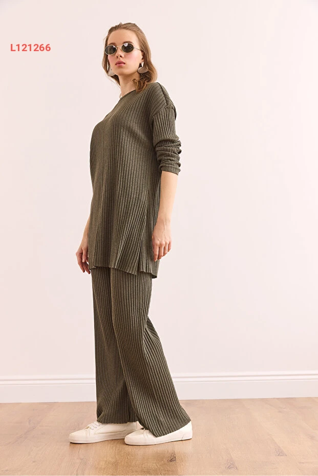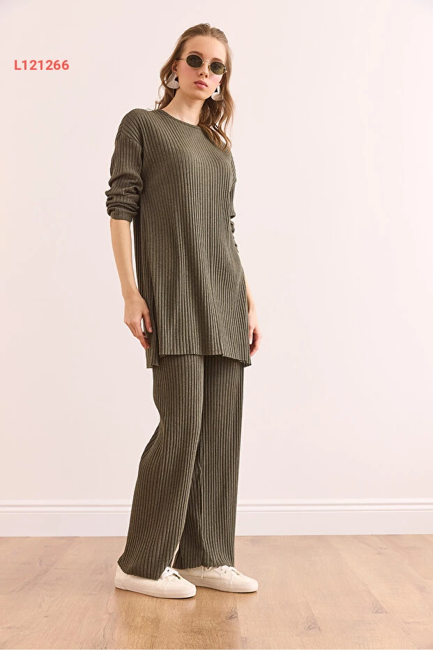 استمتعي بإطلالة أنيقة وعصرية مع طقم Olalook الذي يتضمن بلوزة بلون الهاكي وجزء سفلي بتصميم بالازو مع خطوط جميلة. يتميز بقصته الواسعة والفتحات الجانبية، ما يضفي لمسة من الجاذبية والراحة طوال اليوم. اجعلي كل لحظة مميزة مع هذا الطقم الذي يناسب كل المناسبات!