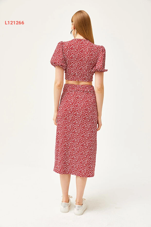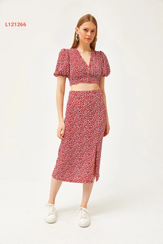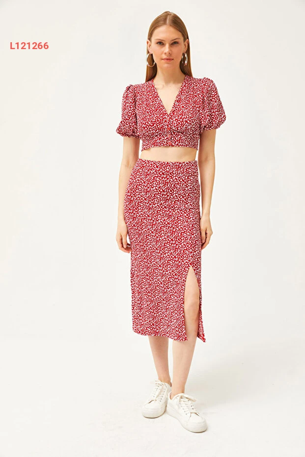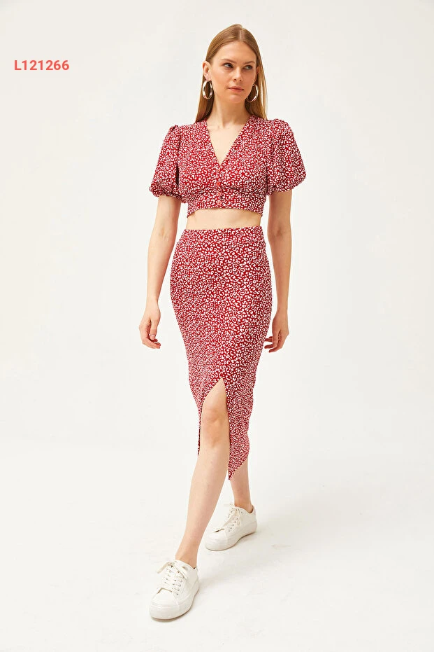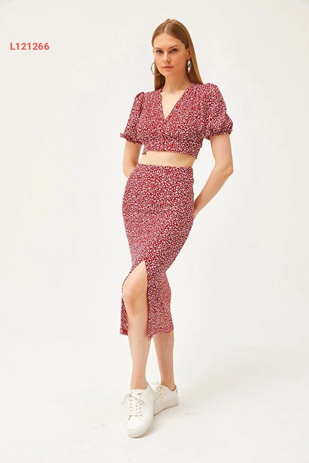 طقم بلوزة حمراء مزودة بأزرار مع تنورة مفتوحة من الأسفل للنساء - TKM-19000263