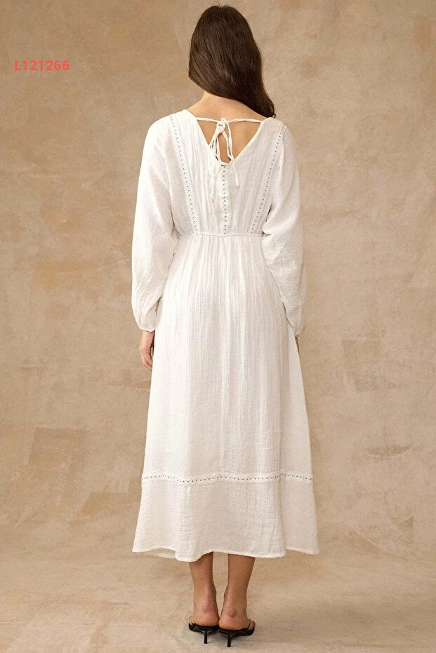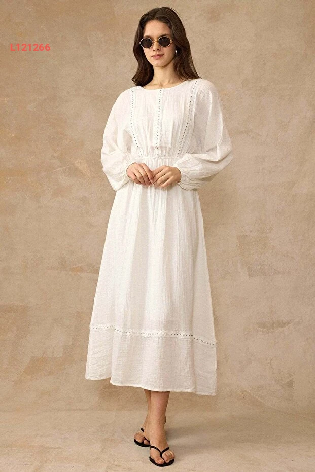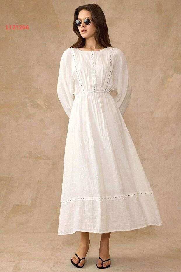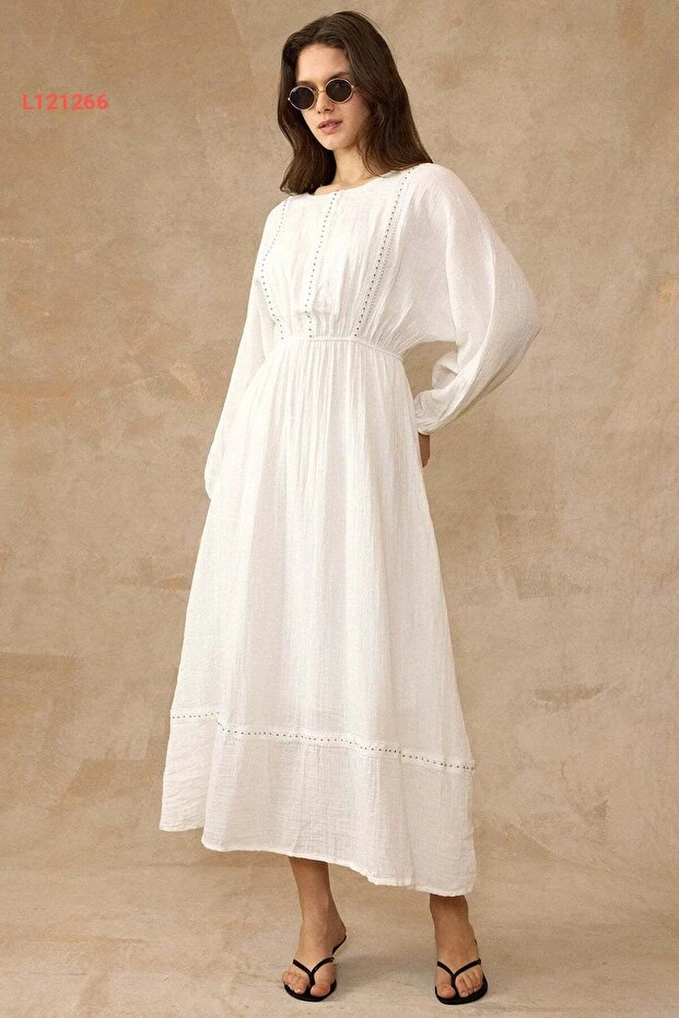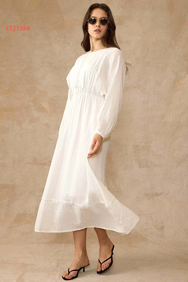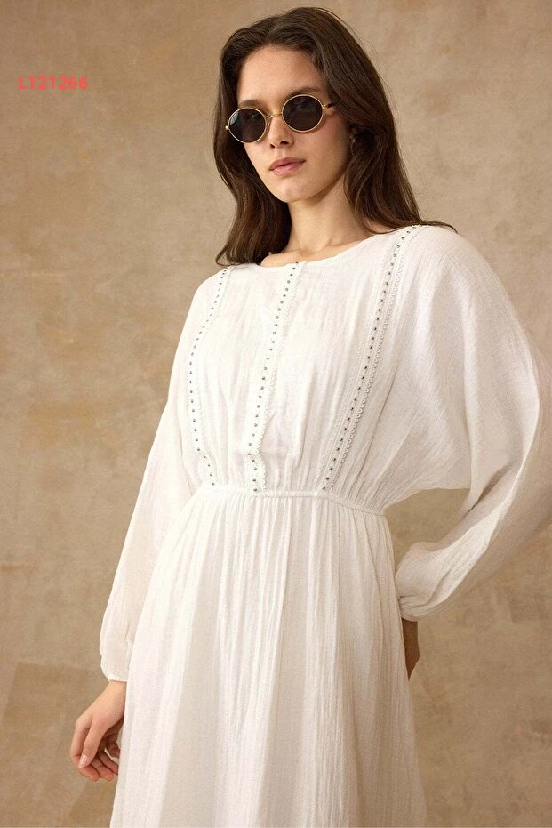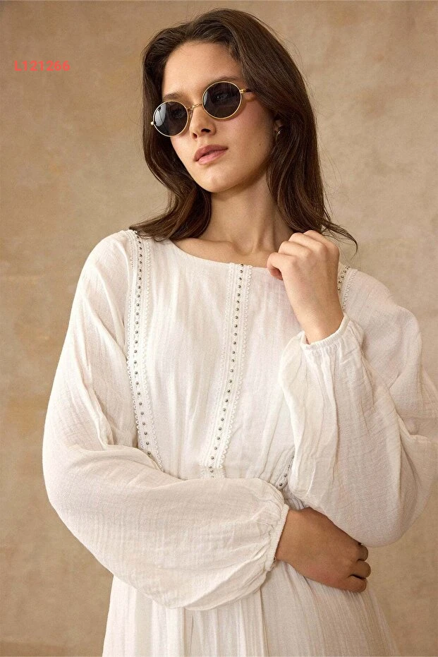 استمتعي بأناقة الاسترخاء مع فستان Olcay ذو التفاصيل الشريطية وحزام الخصر المرن. مصمم من قماش الموسلين الناعم، يوفر لك الراحة المثالية لمختلف المناسبات، بينما يضيف اللون الكريمي لمسة من الأنوثة والجاذبية. لا تفوتي الفرصة لتكوني محط الأنظار بأسلوبك الرائع!
