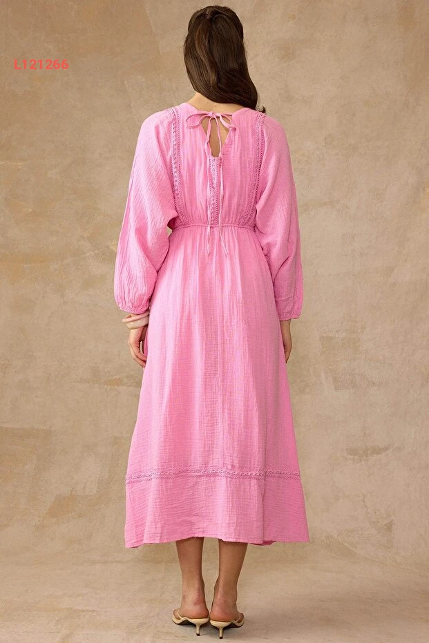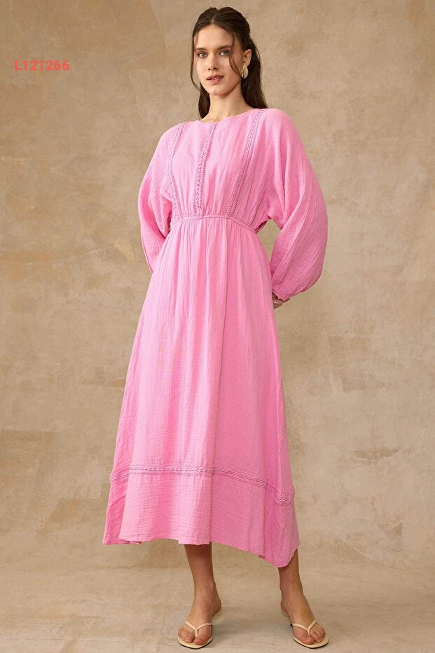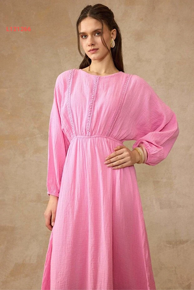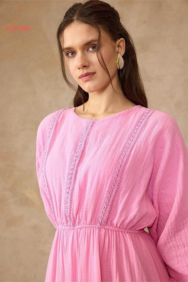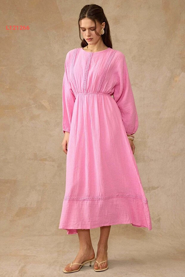 استمتع بإطلالة ساحرة مع فستان Olcay Şerit Detaylı Beli Lastikli Müslin بلون وردي جميل. يتميز بتصميمه الأنيق وقصته المريحة ذات الخصر المطاطي التي تضفي لمسة من الأناقة على راحتك. مصنوع من قماش الموسلين الخفيف، هذا الفستان مثالي لأيام الصيف المشمسة أو المناسبات الخاصة، مما يجعلك تتألقين بكل ثقة.