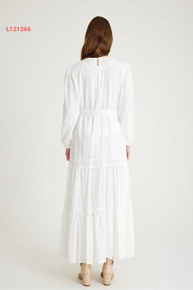 فستان طويل مزين بالدانتيل برباط خصر من القطن - أبيض