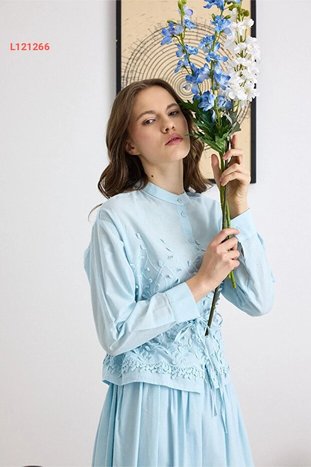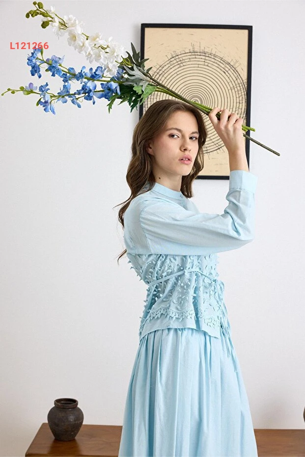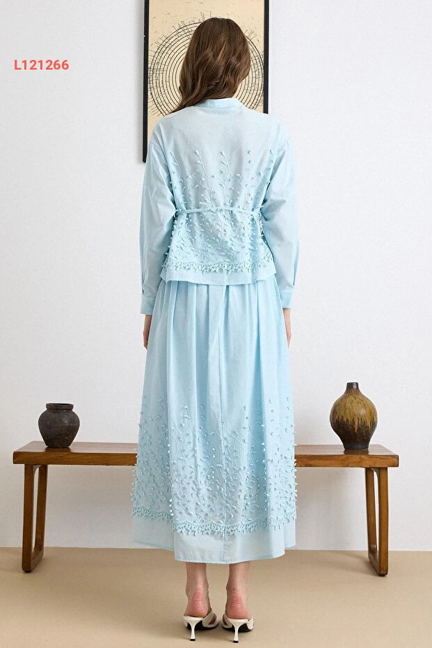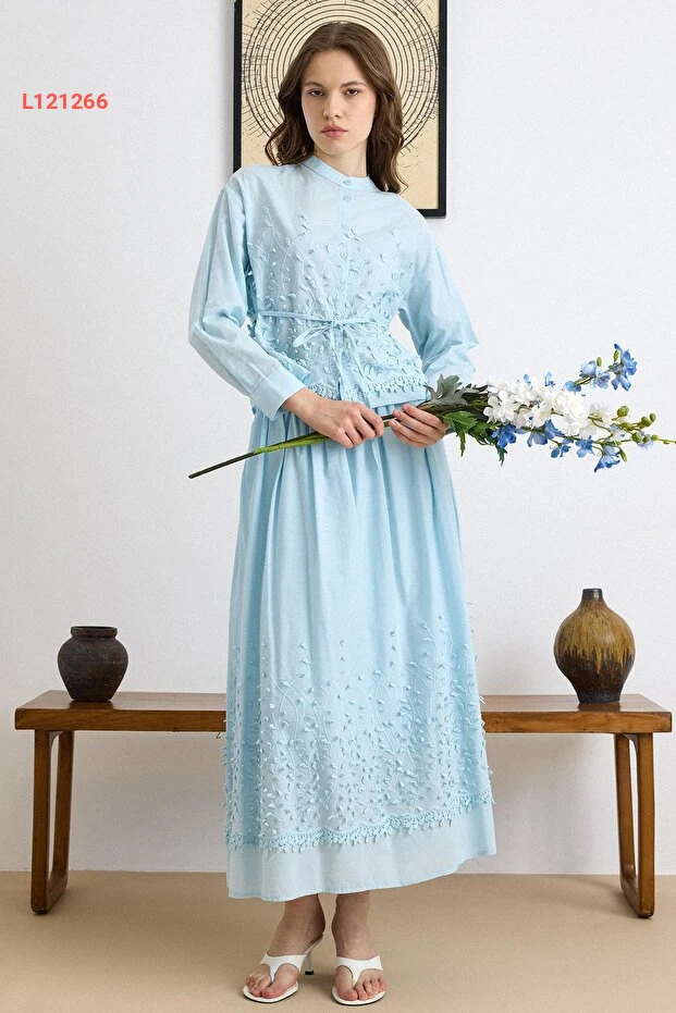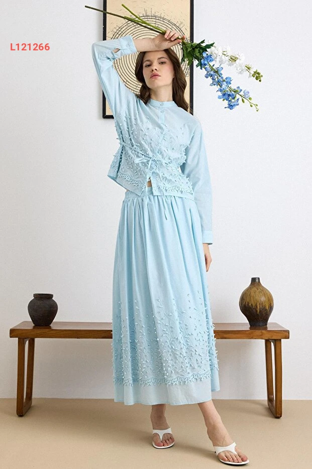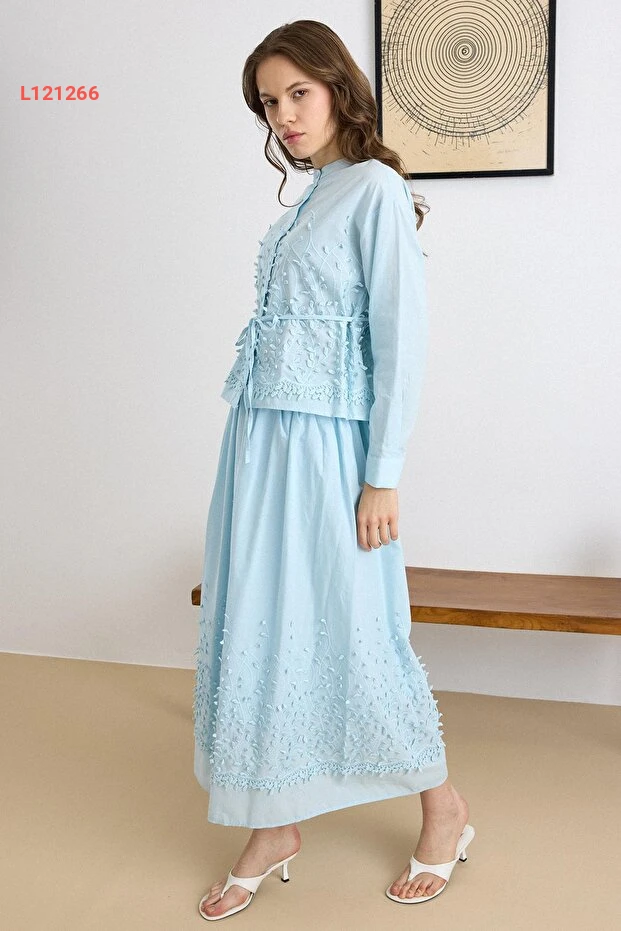 استمتع بأناقة لا تضاهى مع طقم Olcay Üç Boyutlu Aplikeli، حيث يجمع بين الجمال والراحة بفضل تصميمه الفريد والمبتكر. القميص والتنورة باللون الأزرق مزينان بتفاصيل ثلاثية الأبعاد تضيف لمسة من الفخامة، مما يجعله الخيار المثالي لكل الأوقات والمناسبات. ارتدي هذا الطقم المميز لتتألقي بإطلالة ساحرة وجذابة!