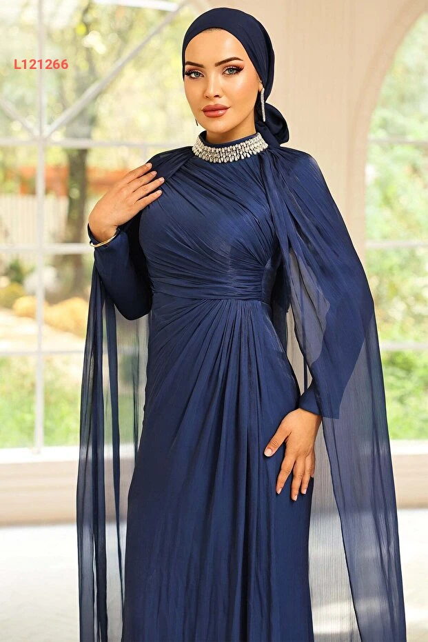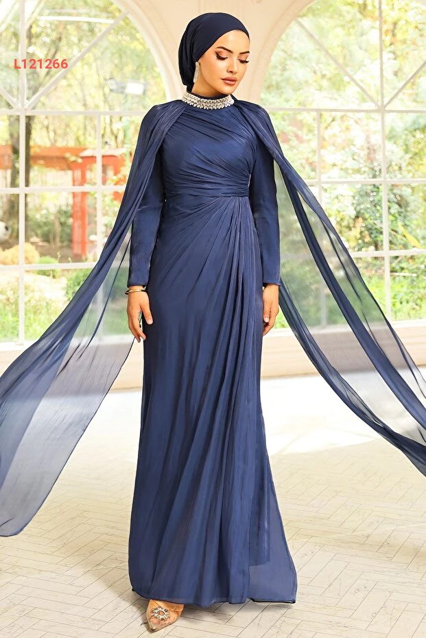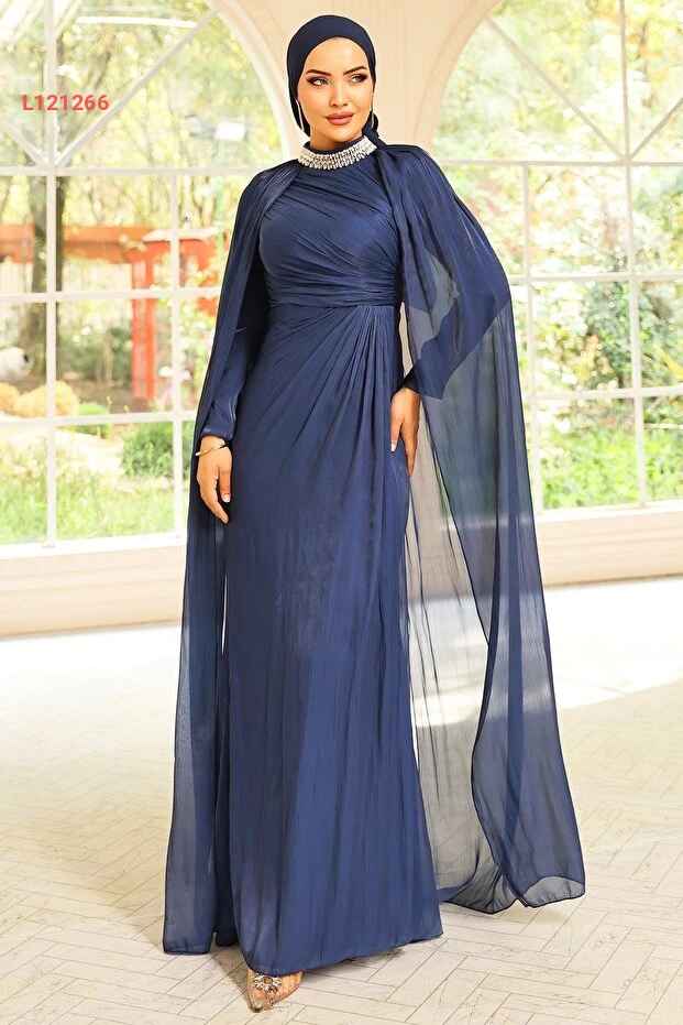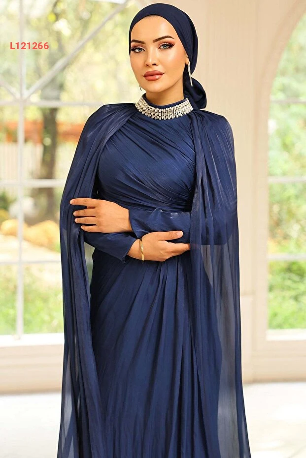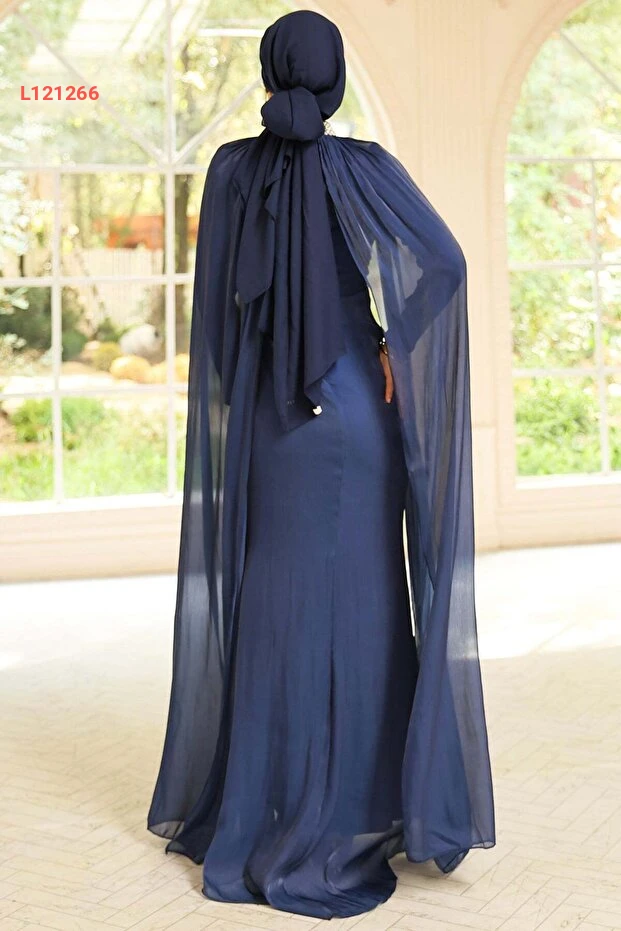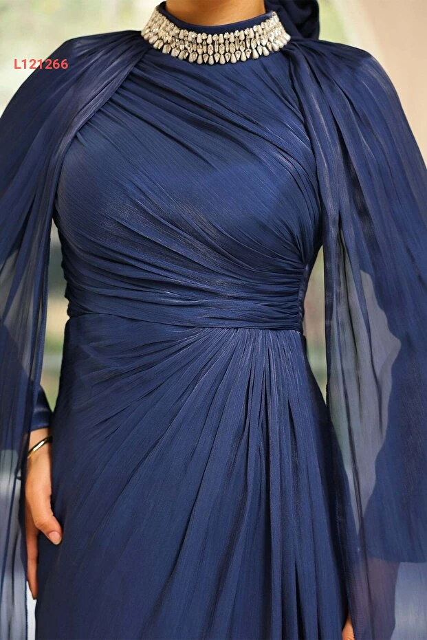 فستان سهرة بتفاصيل كاب مزخرفة بالأحجار من حرير يوريو برقبة أولجا - كحلي 1247