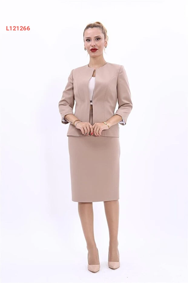 ستايل أنيق - طقم سترة قصيرة بياقة بيضاوية وتنورة قلم قصيرة - لون البيج