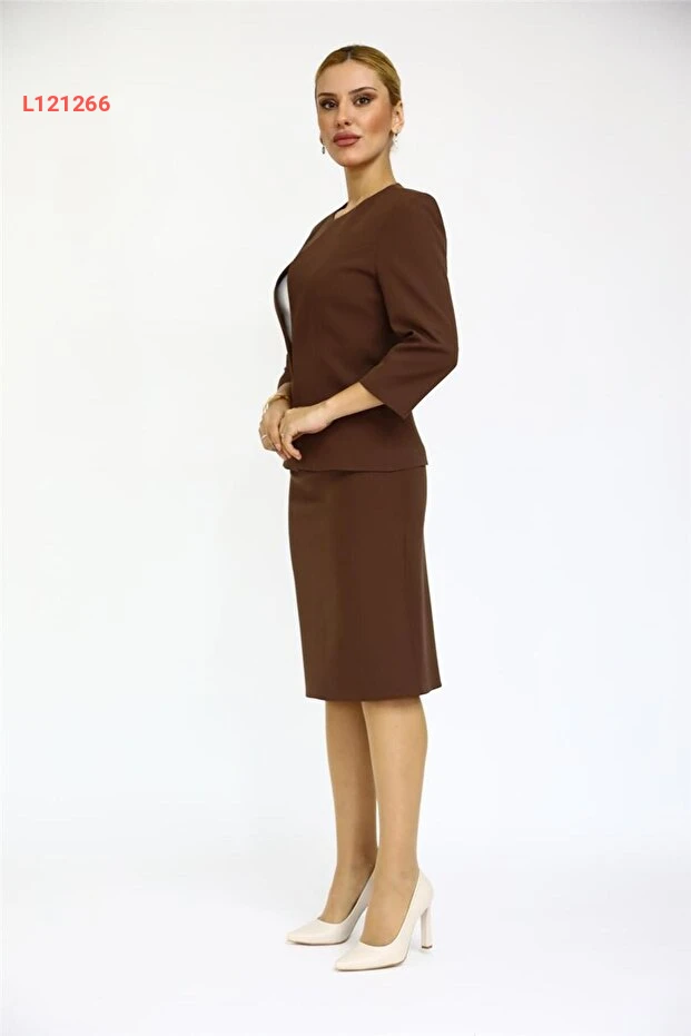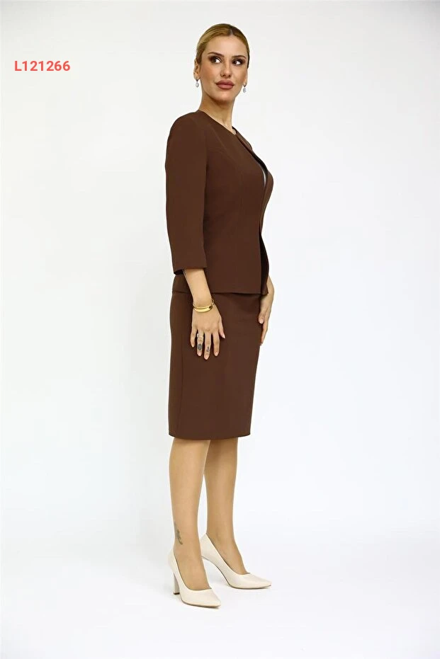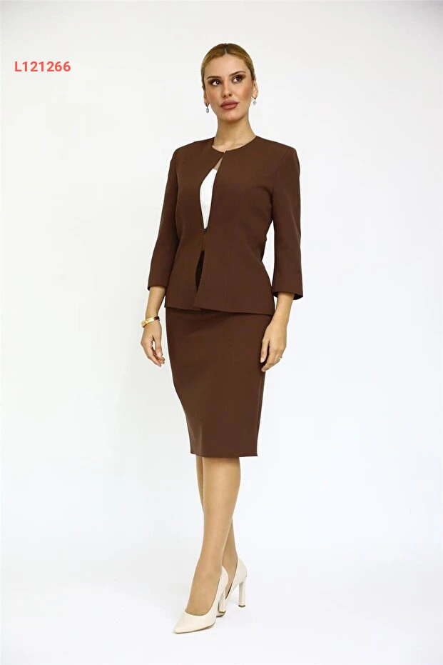 اكتشفي الأناقة العصرية مع مجموعة ÖNDER ÖZSOY، حيث يأتي الجاكيت بلا ياقة مع تصميم بسيط يضفي لمسة من الأناقة على أي إطلالة. يتكامل مع التنورة المستقيمة الضيقة باللون الكستنائي، ليمنحك مظهراً متكاملاً يناسب كل المناسبات سواء كانت رسمية أو غير رسمية. ارتدي هذه القطع المميزة لتسحر الجميع بأناقتك الاستثنائية!