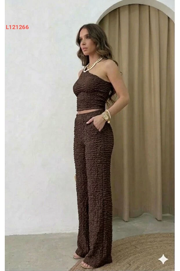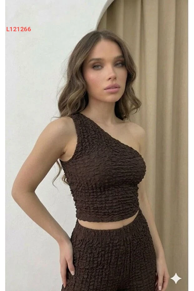تومي برازيل - طقم بلوزة كتف واحدة وبنطلون عالي الخصر مزدوج الجيب - مريح - بني
