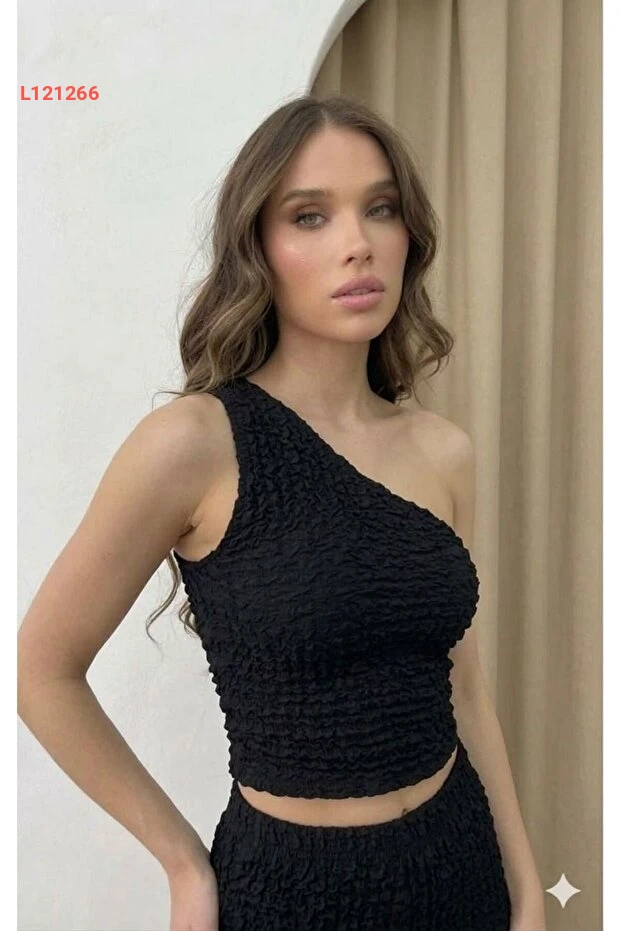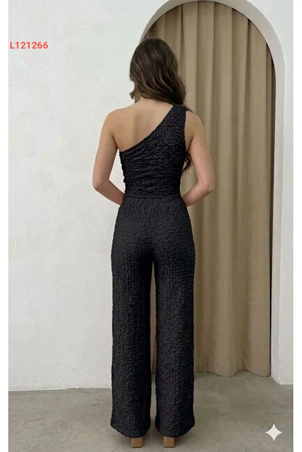 بدلة نسائية عصرية بكتف واحد من بديوم مزين بقماش بوريوم - بنطلون عالي الخصر بجيوب مزدوجة - أسود