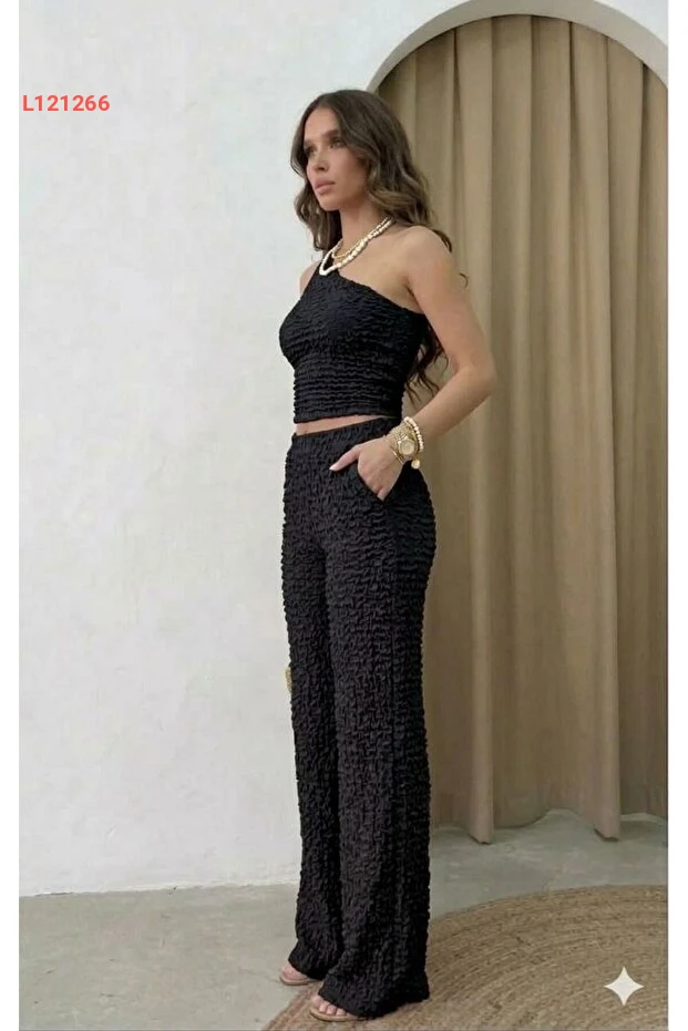 استمتعي بالأناقة والراحة مع طقم "onlymoon" المكون من خامة بُرمجوك الفاخرة، والذي يتميز بتصميمه بكتف واحد وكنزة عصرية. يجمع البنطال العالي الخصر والذو الجيوب الثنائية بين الأناقة والوظائف، مما يجعله الخيار المثالي للتألق في كل مناسبة. تميزي بإطلالة ساحرة وأنيقة مع هذا الطقم الأسود الأنيق!
