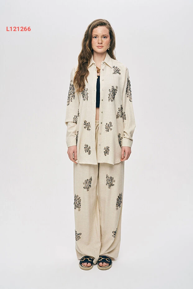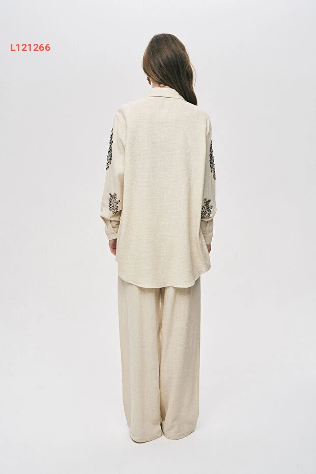 قميص نسائي بتصميم فضفاض من القطن والكتان مزين بالخرز من أورفيو نيجرو