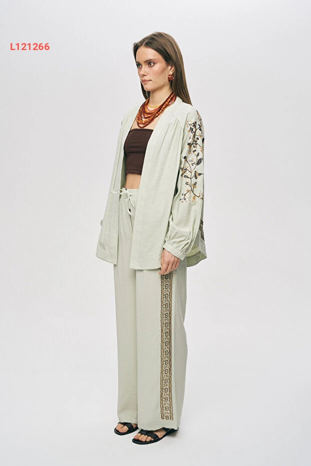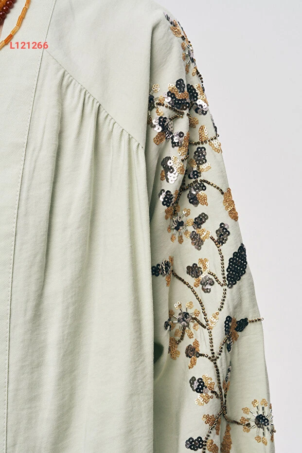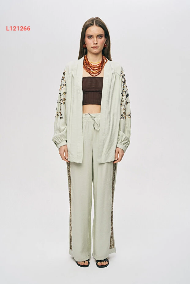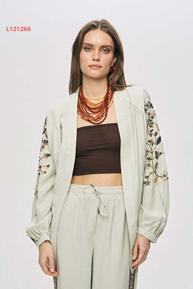 اجذبي الأنظار مع الكيمونو الأنيق من أورفيو نيجرو، الذي يتميز بتطريزات الراقة من البايت والخرز التي تضفي لمسة من السحر على إطلالتك. تصميمه الواسع يوفر الراحة والحرية في الحركة، مما يجعله الخيار المثالي لمناسباتك الخاصة أو حتى لاستخدامه في الأيام العادية. تألقي بأناقة مع كل خطوة وتأكدي من أن كل عين على الأناقة العصرية!