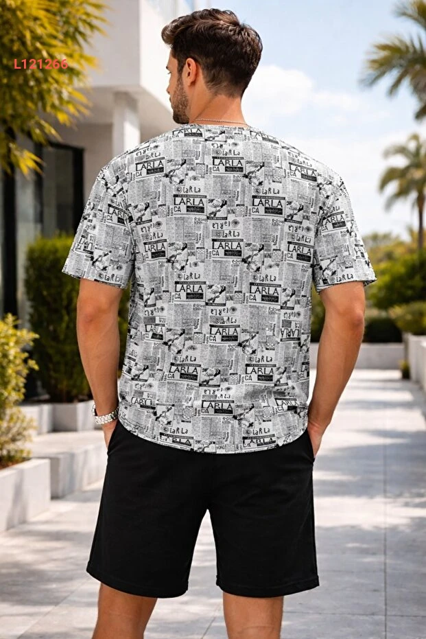 طقم صيفي للرجال من أورين لايف: تيشيرت واسع مزخرف وبنطلون شورت أسود