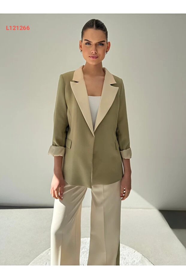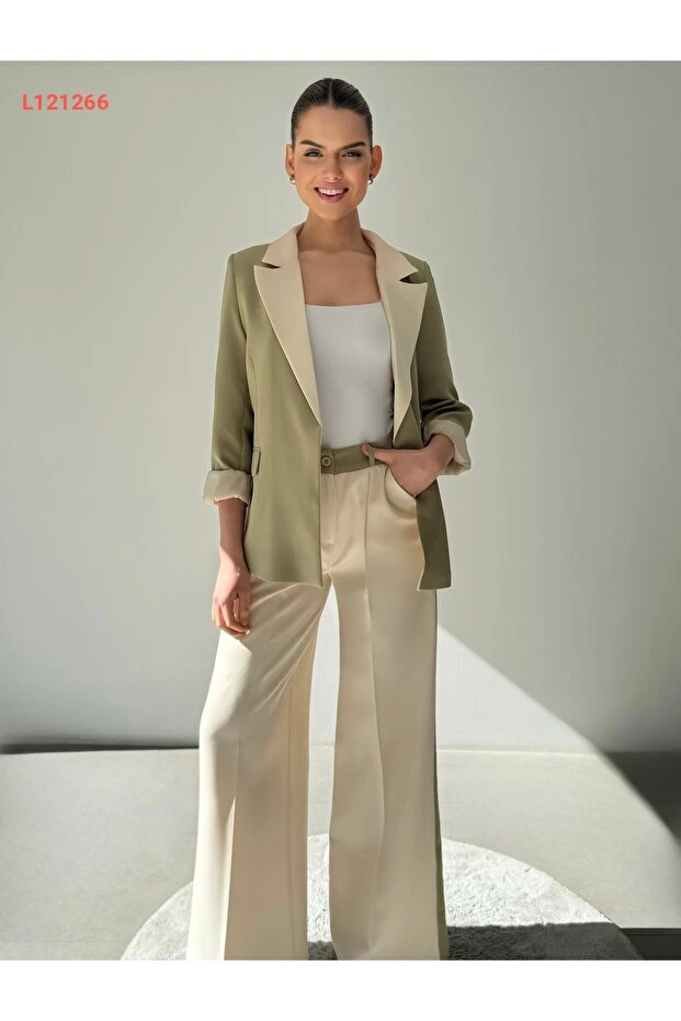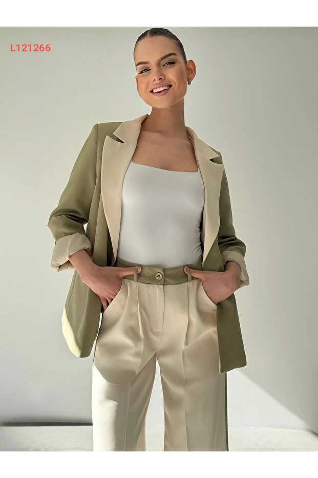 استمتع بلمسة من الأناقة العصرية مع مجموعة ossons Kontrast Renk Garnili، حيث يجمع blazer الخفيف مع بنطال palazzo بتصميم مبتكر. يتميز لون الكريمي الفاتح مع الهاكي الداكن بتناغم رائع يضفي سحراً خاصاً على إطلالتك، مما يجعله مثالياً لمناسباتك اليومية أو السهرات المسائية. ارتدي هذه القطع المميزة لتضمني راحة وأناقة تدوم طوال اليوم.