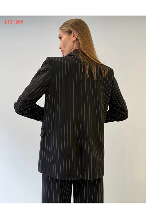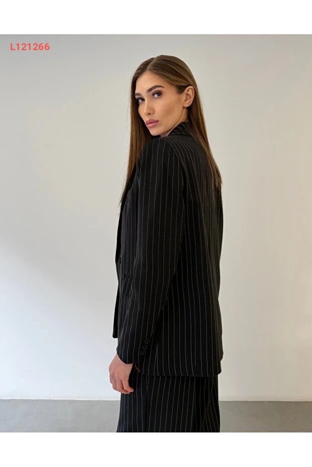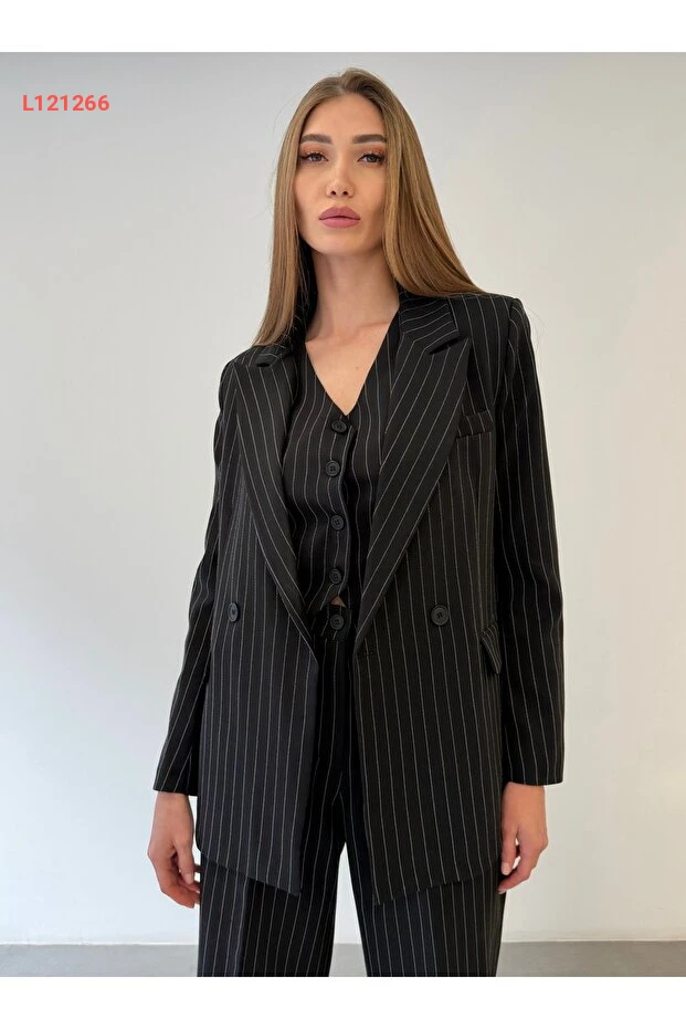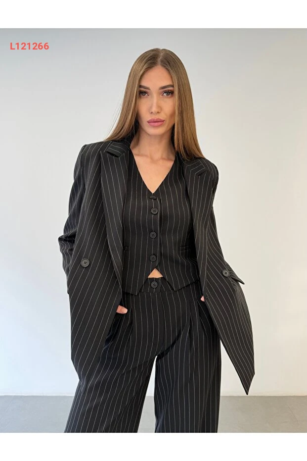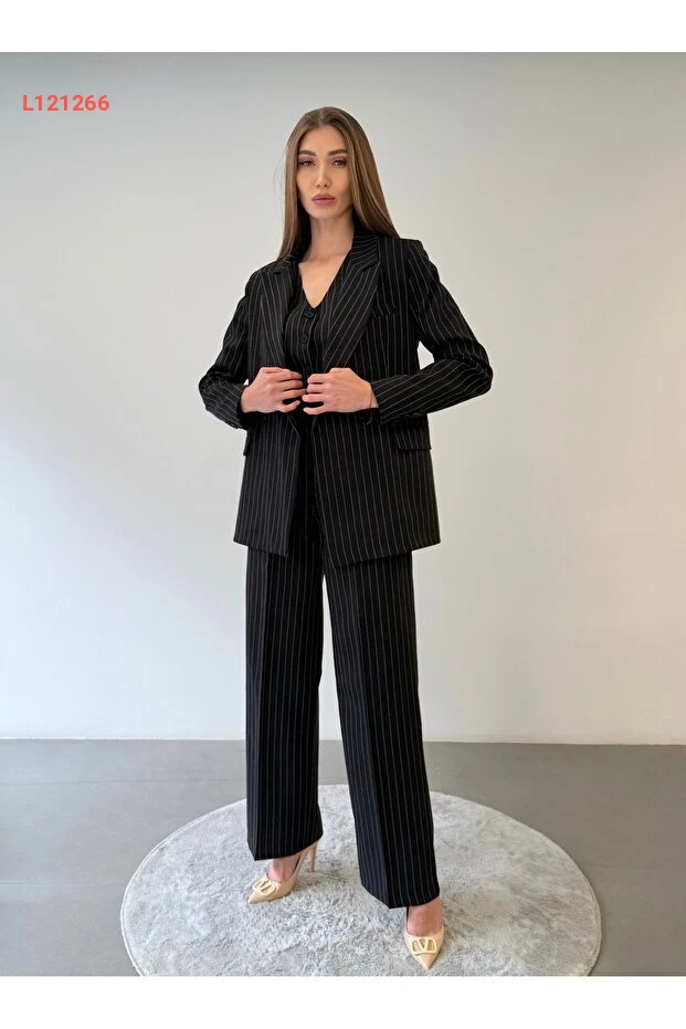 أزياء المكتب العصرية: طقم 3 قطع نسائي يتضمن سترة وقميص وبنطلون مخطط باللون الأسود