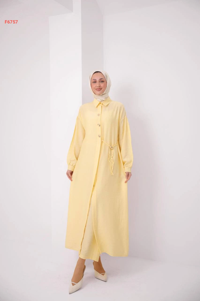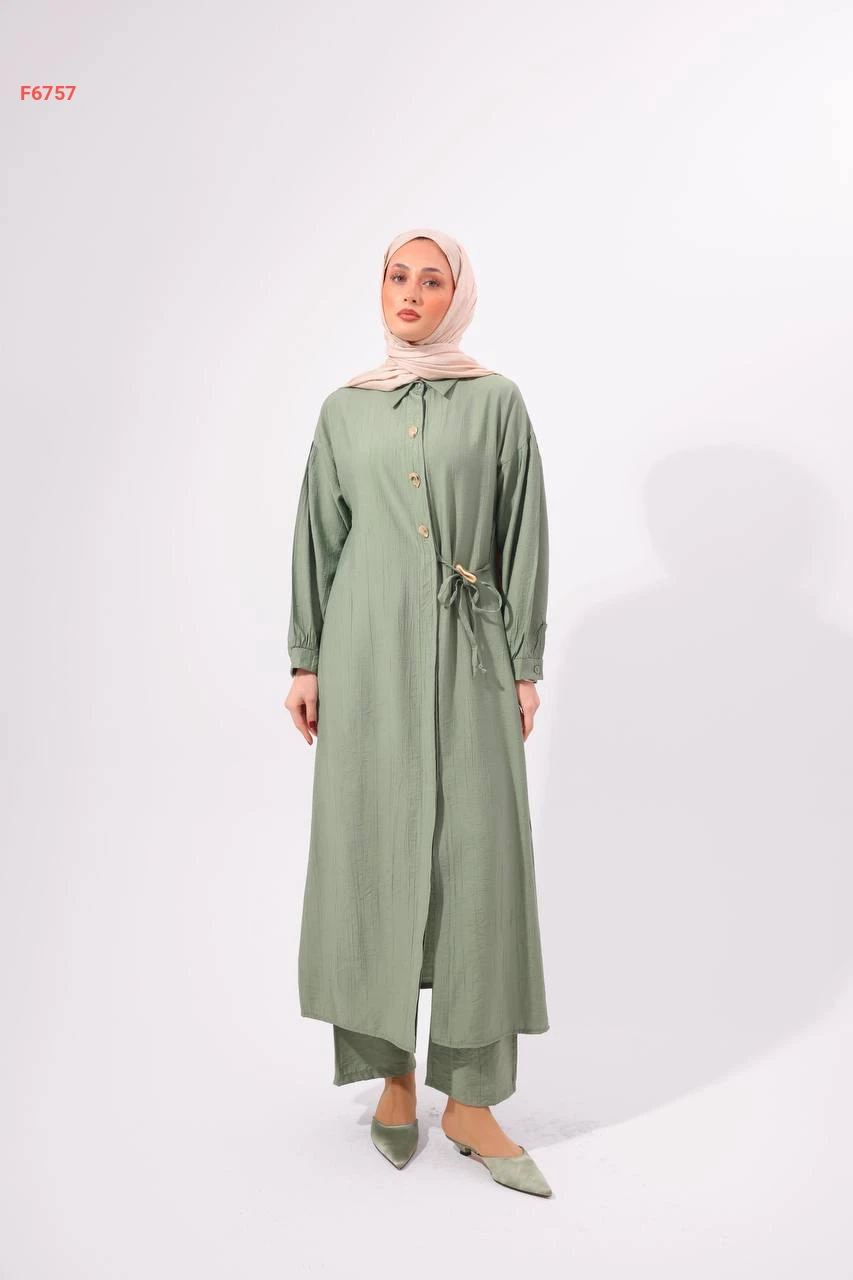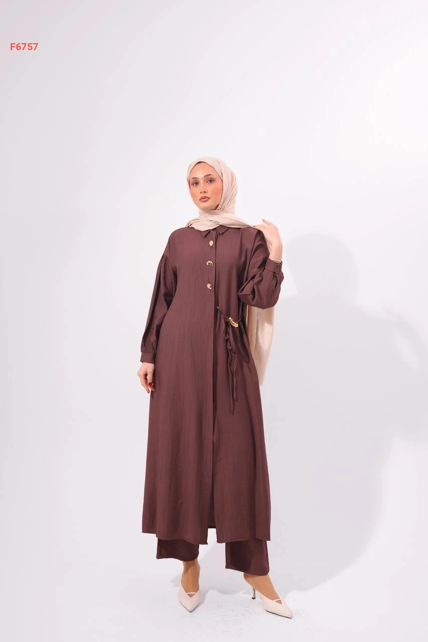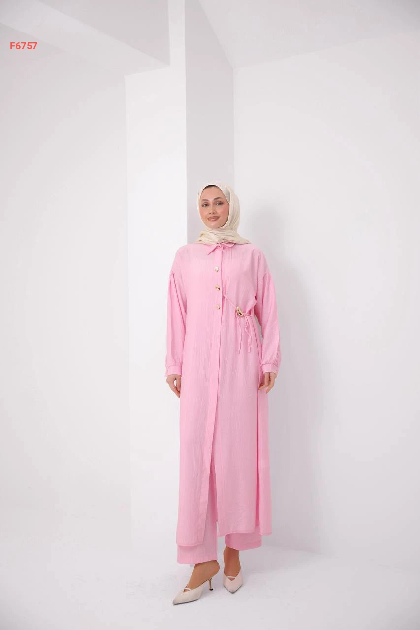 طقم بنطال وقميص طويل بربطة جانبية