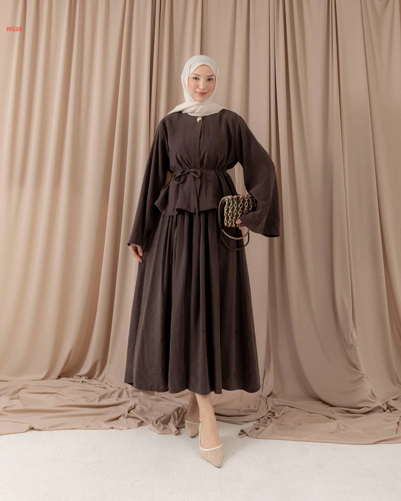طقم بلوزة بخصر مربوط وأكمام واسعة مع تنورة منسدلة