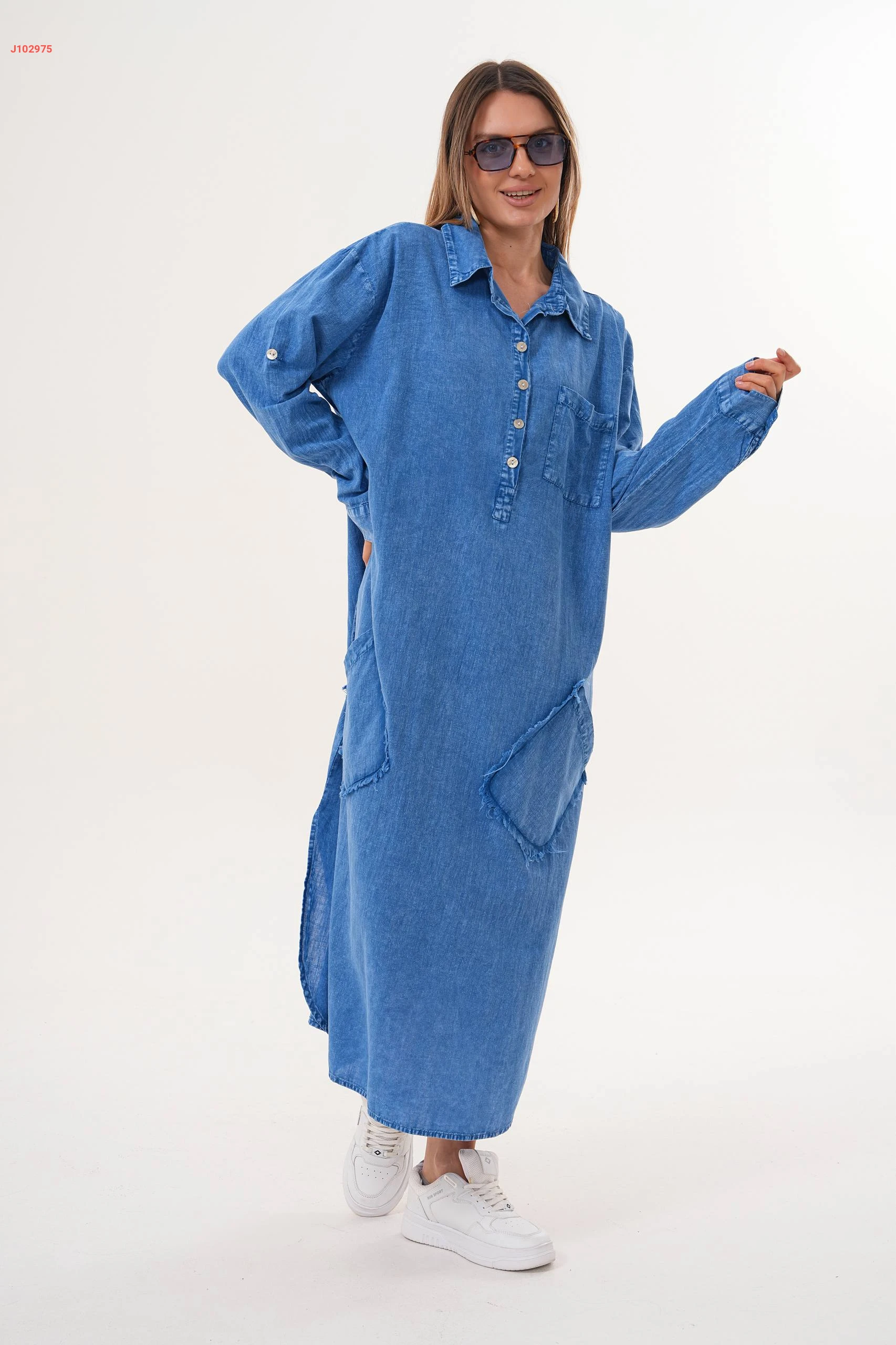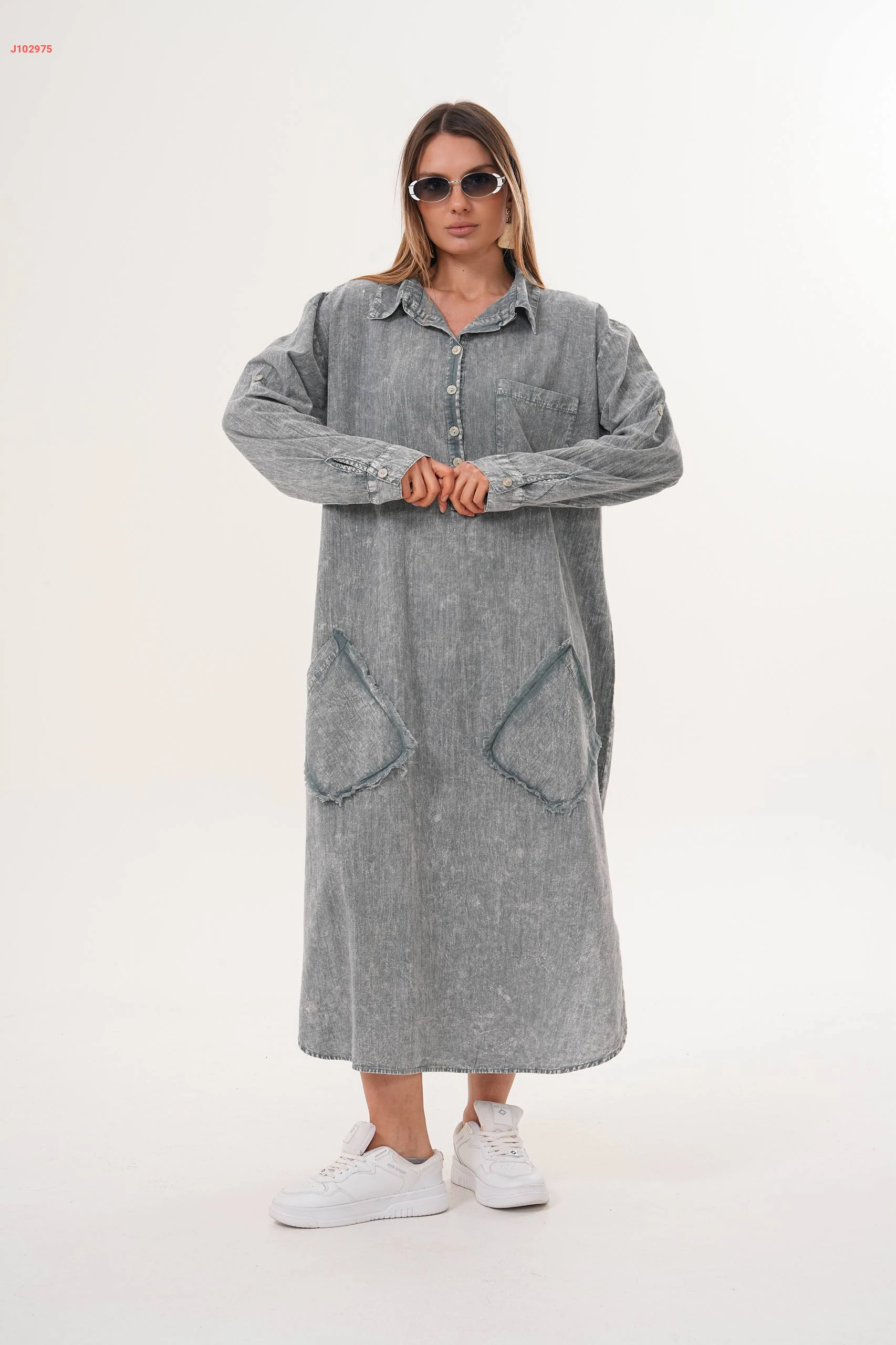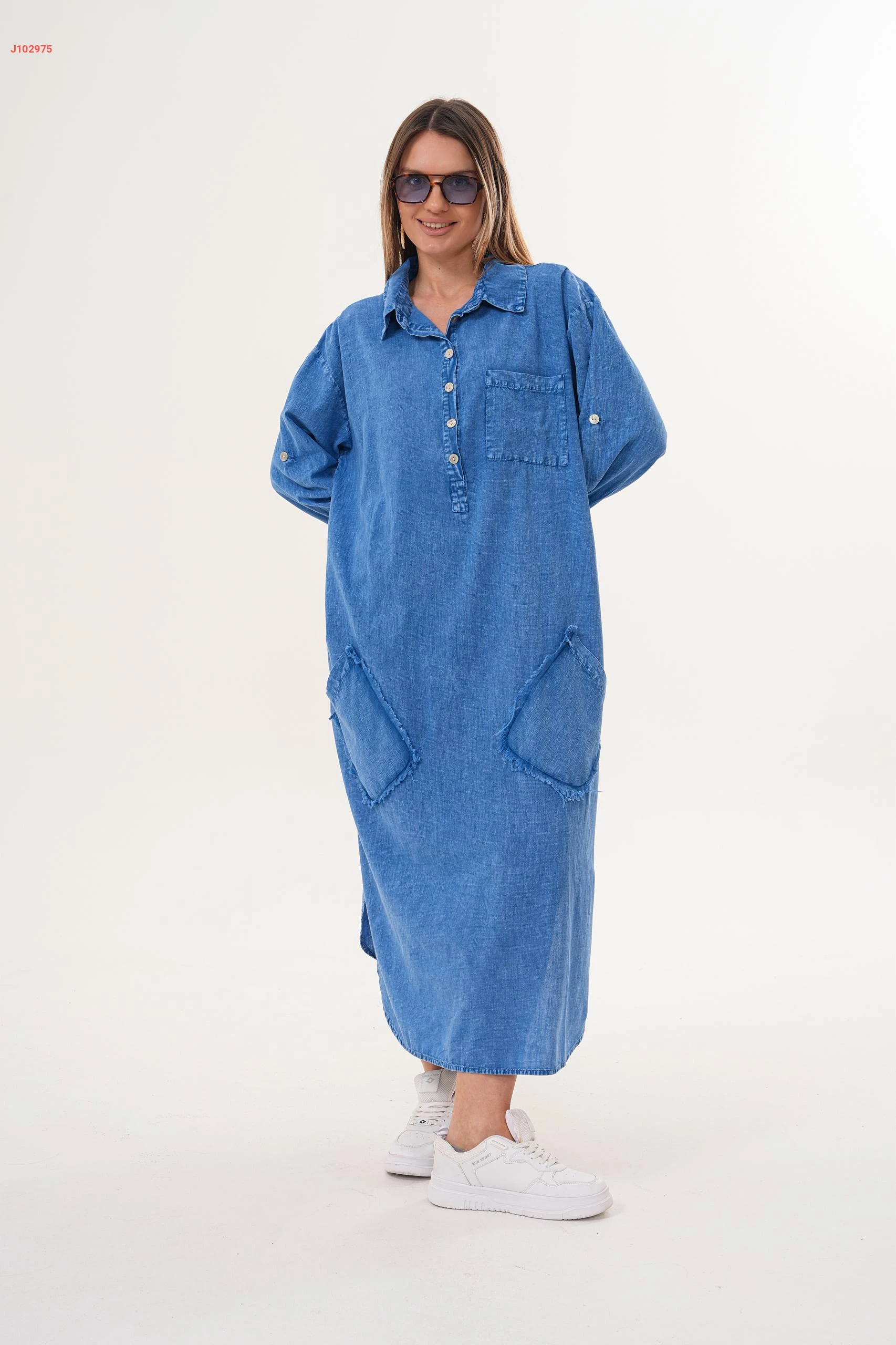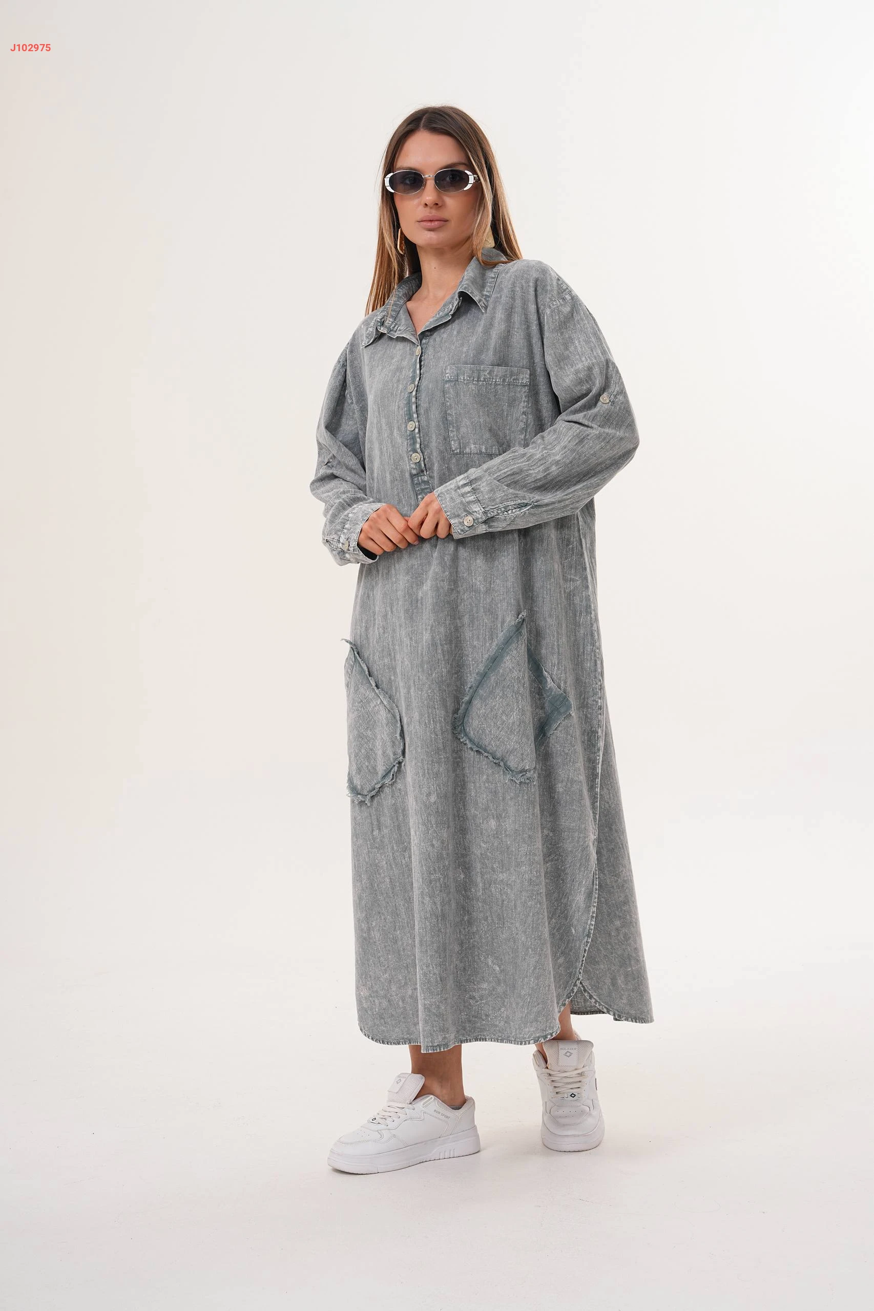 فستان جينز واسع بياقة مرتفعة مع جيب عريضة مقاسات كبيرة