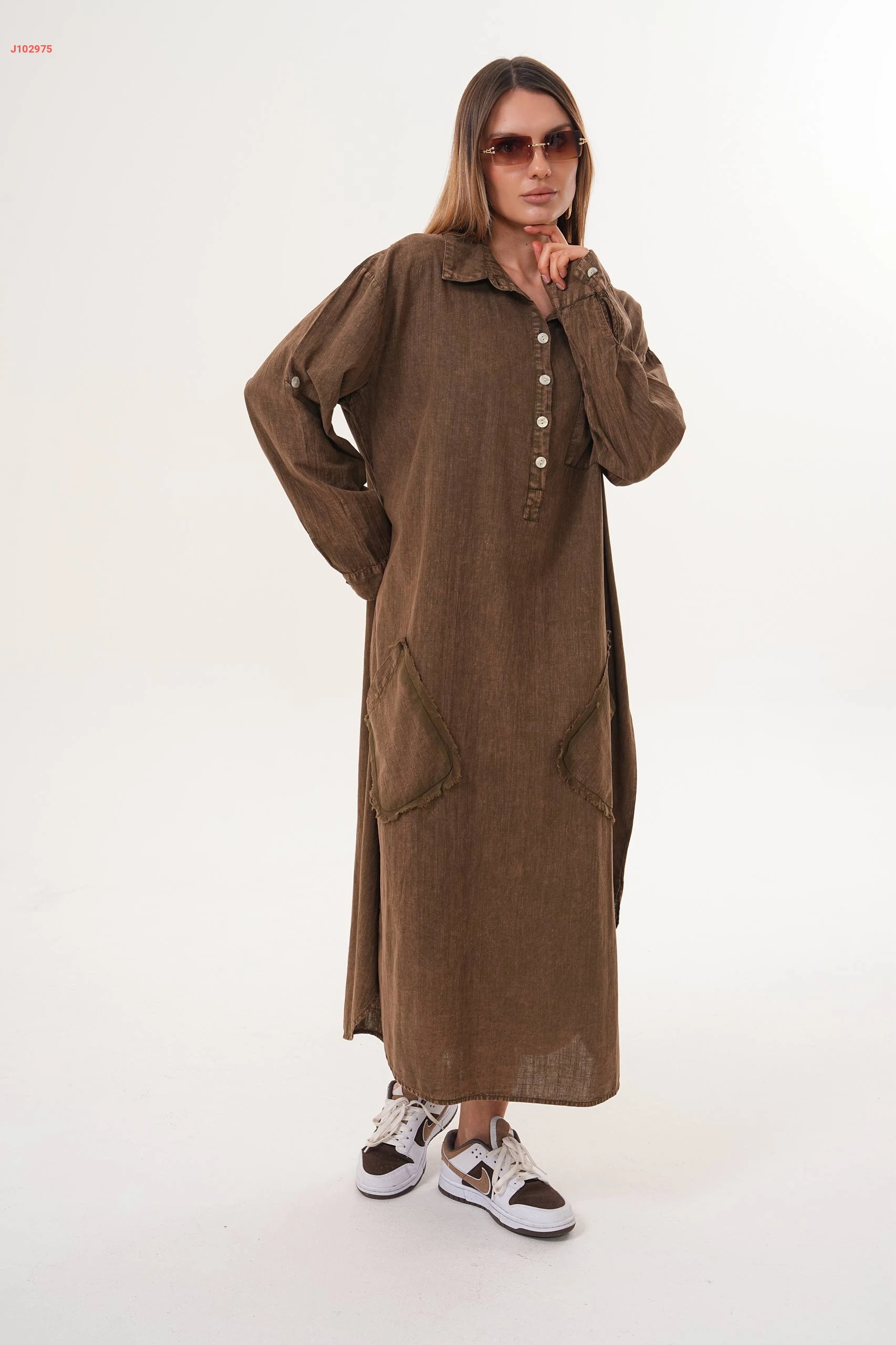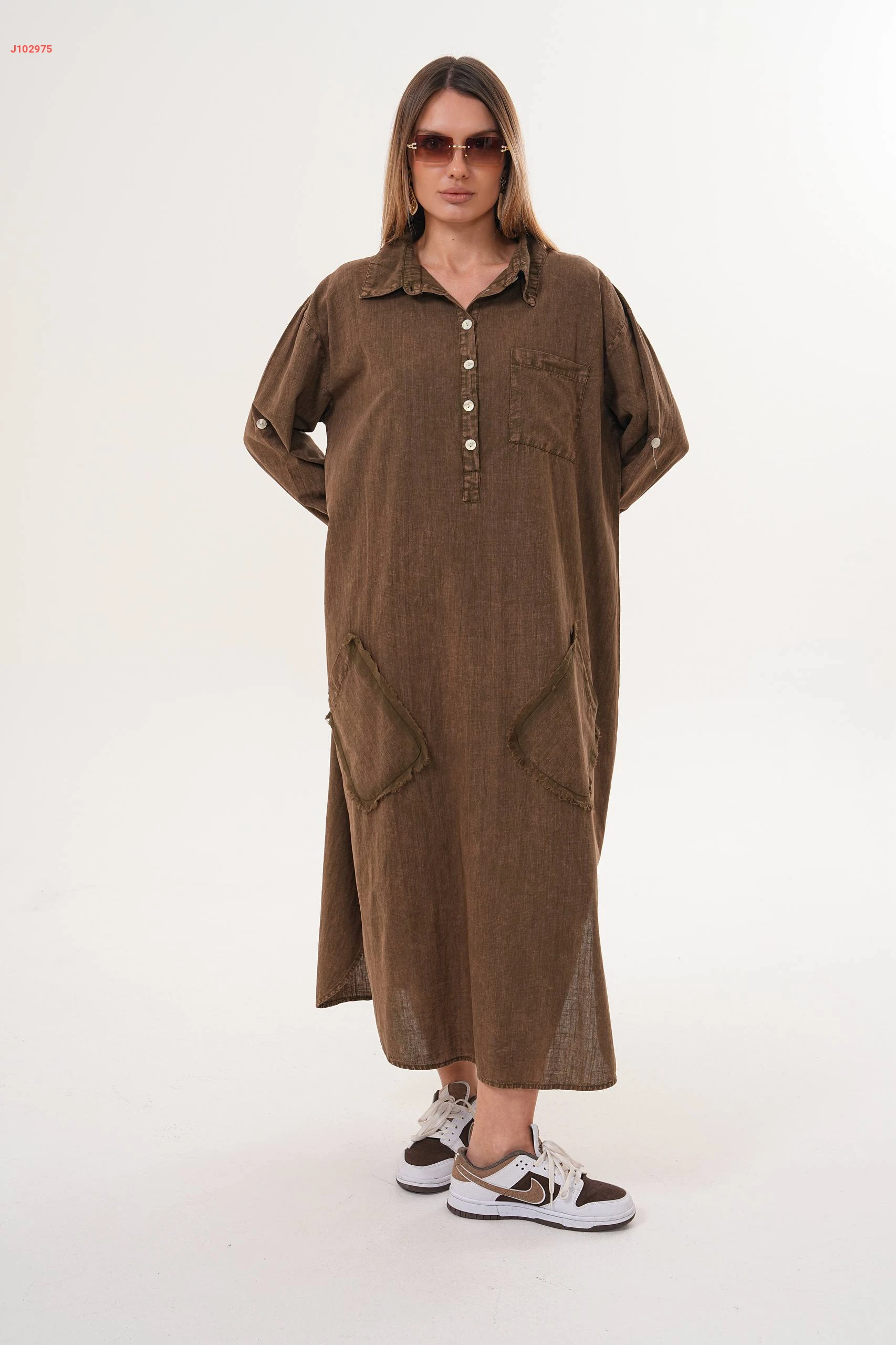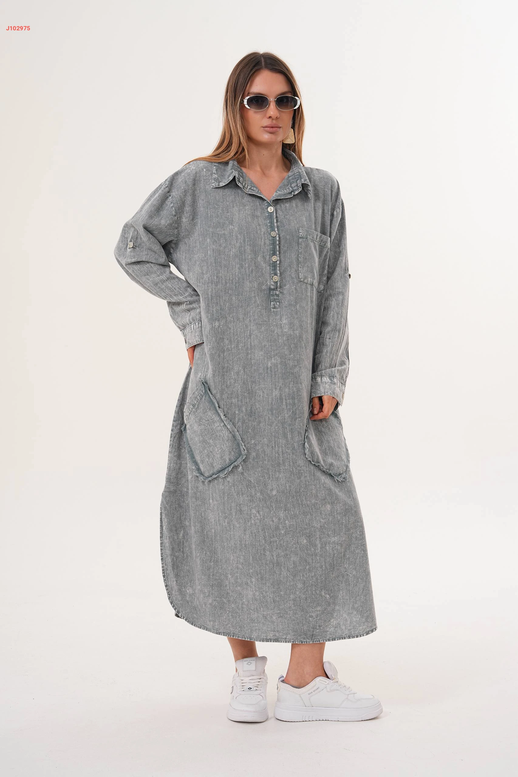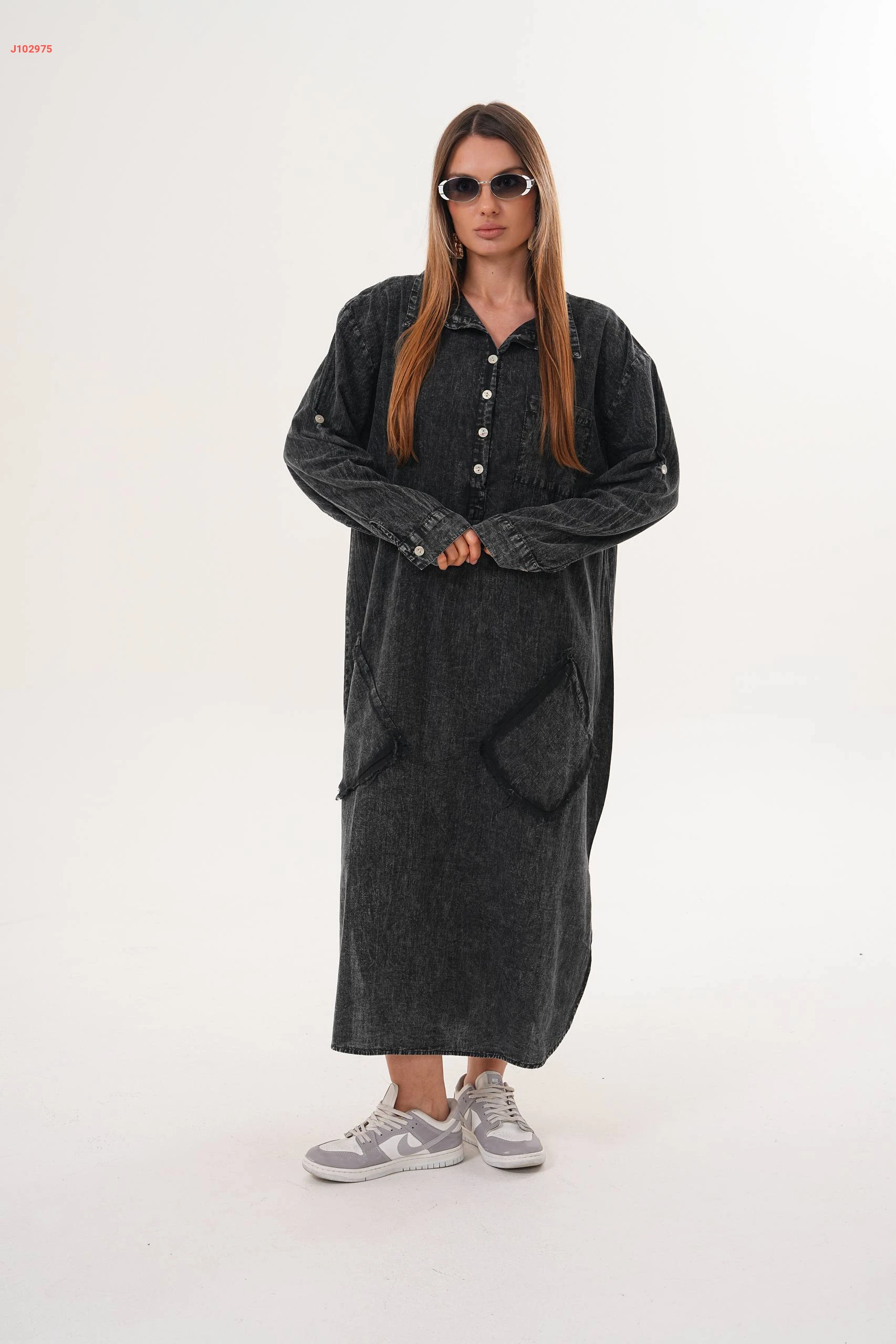 فستان جينز واسع بياقة مرتفعة مع جيب عريضة مقاسات كبيرة