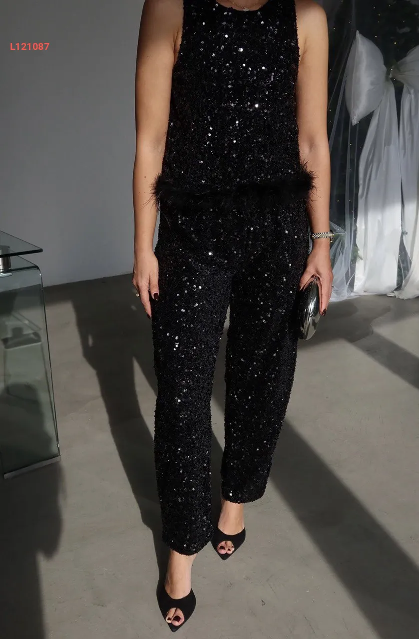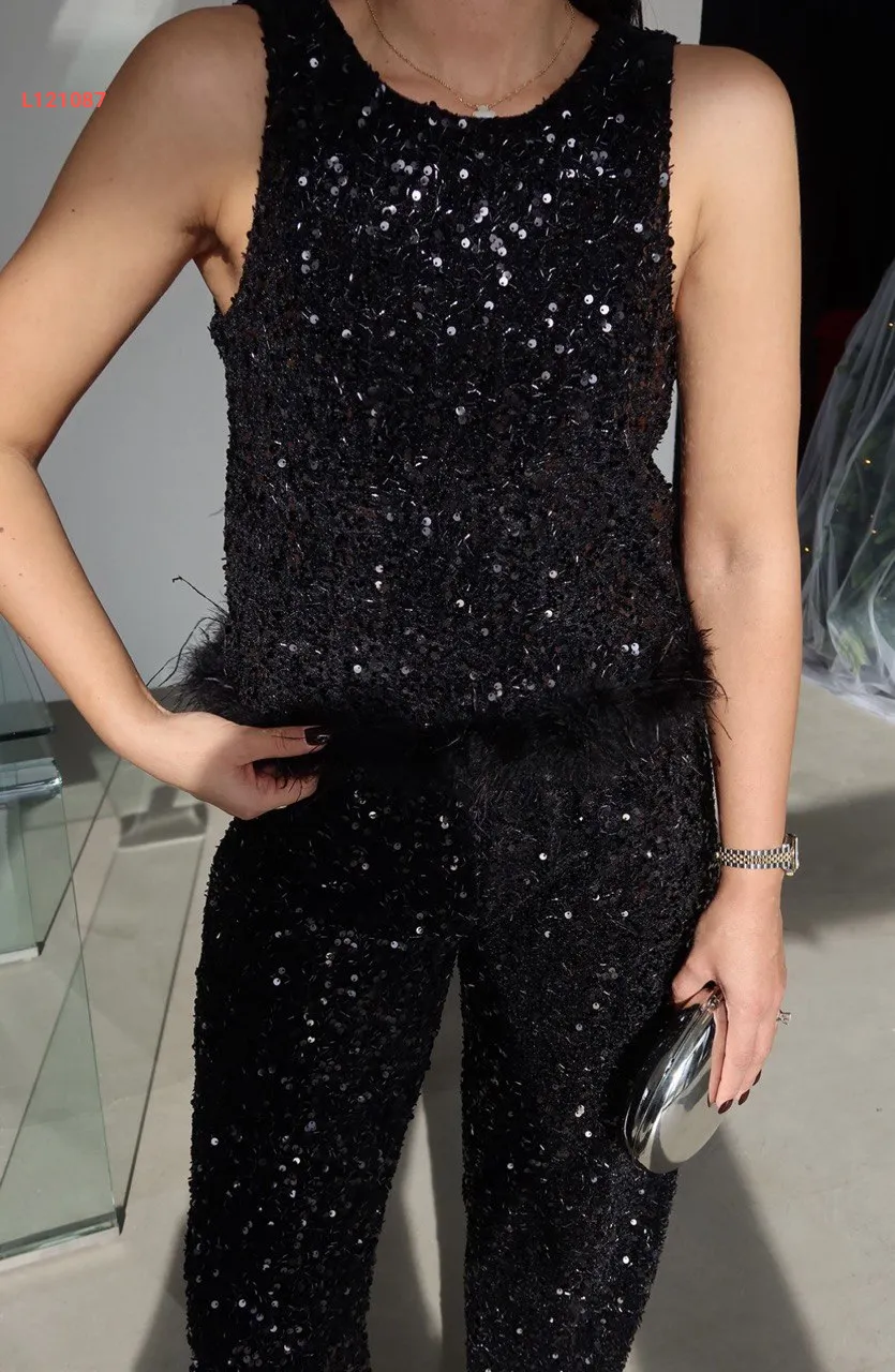 طقم بنطال باييت وبلوزة حفر مع ريش