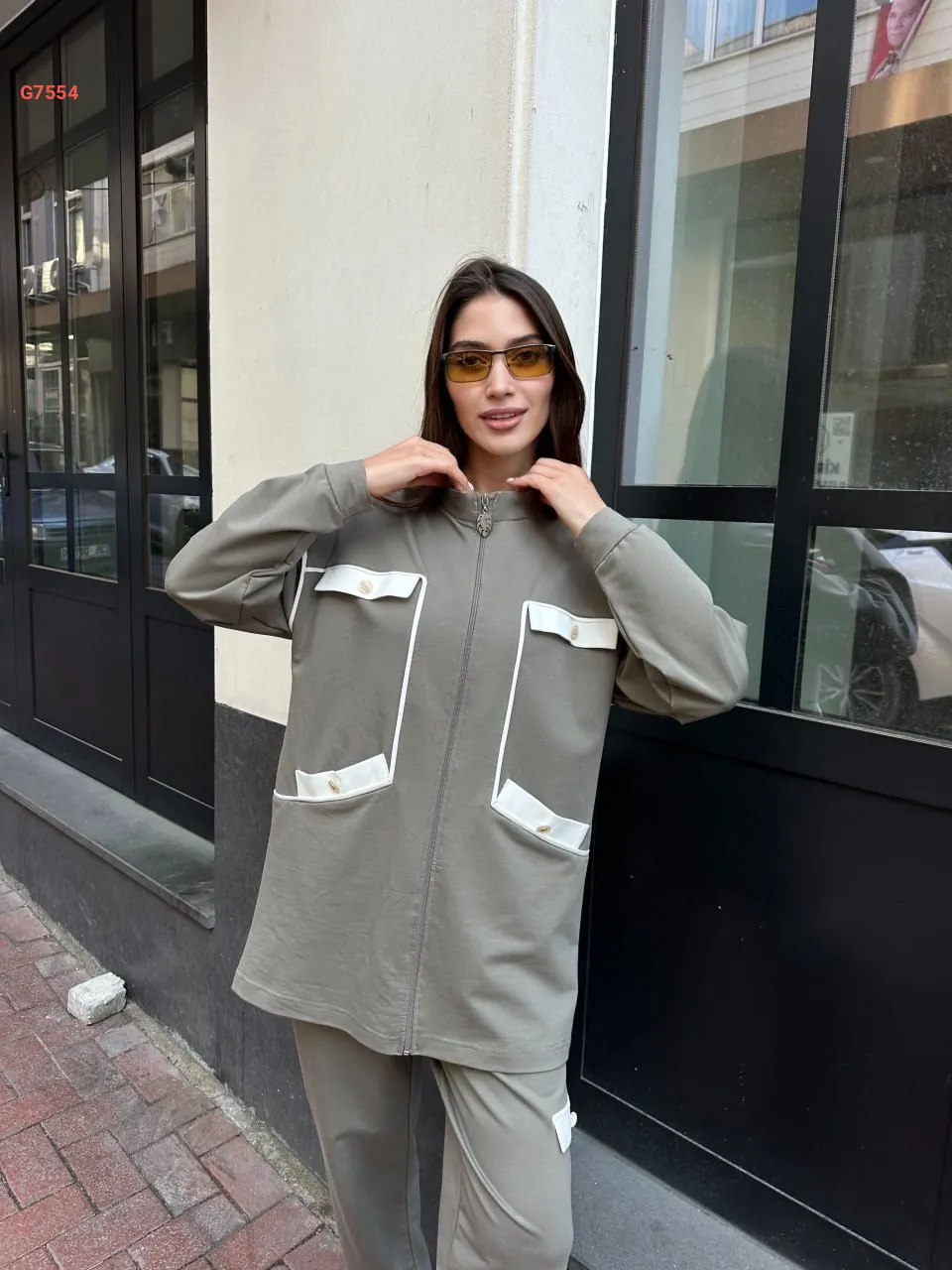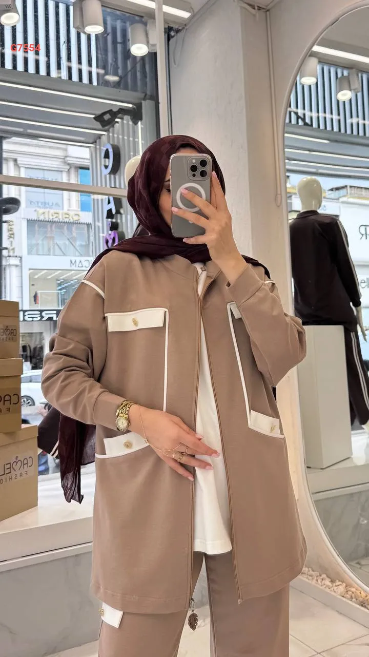طقم بيجامة قطعتين بسحاب مع جيب عريضة