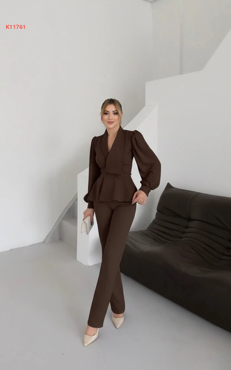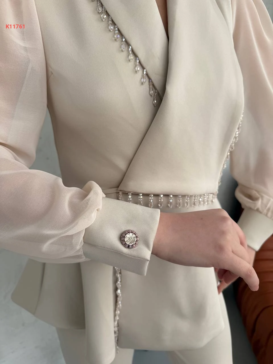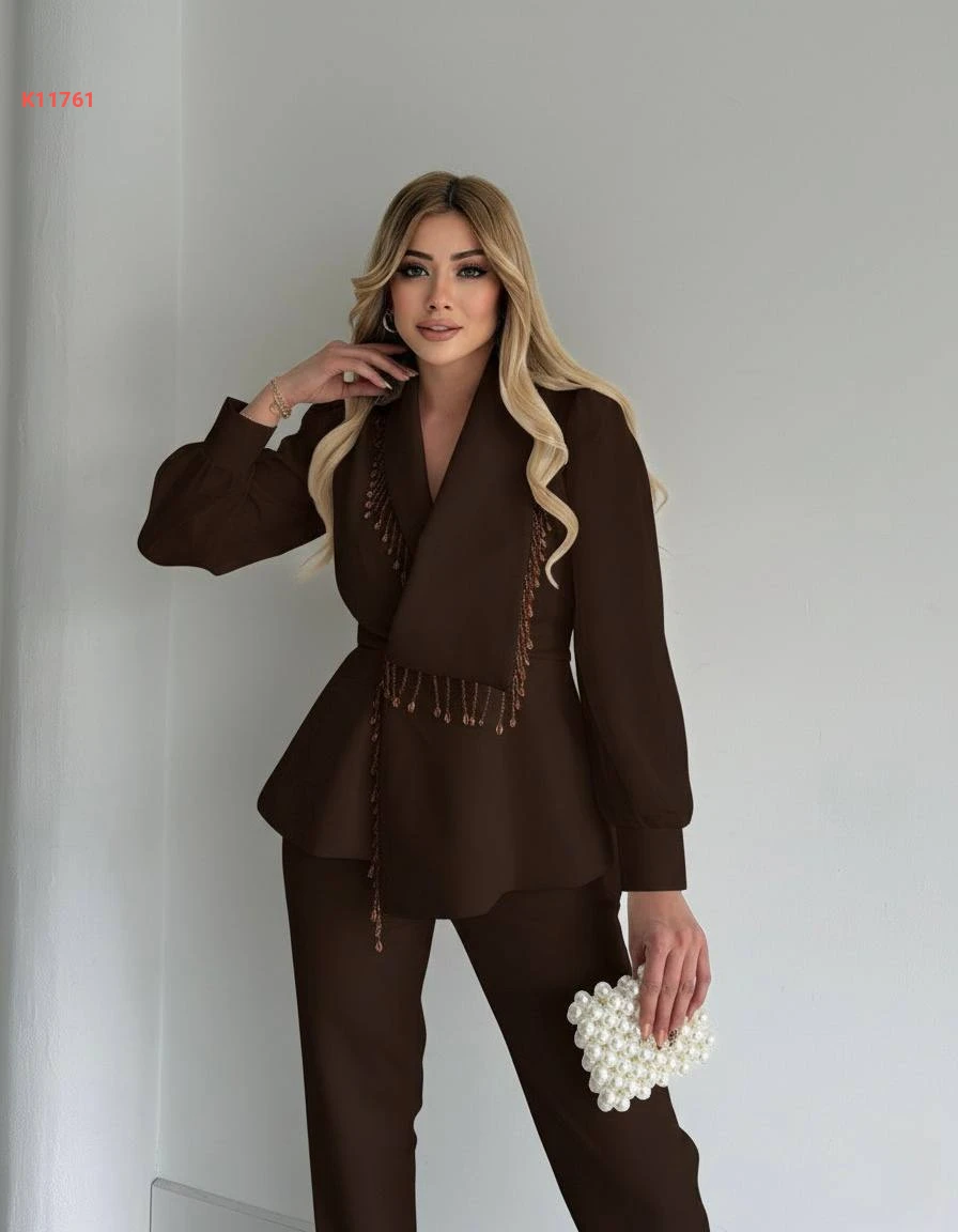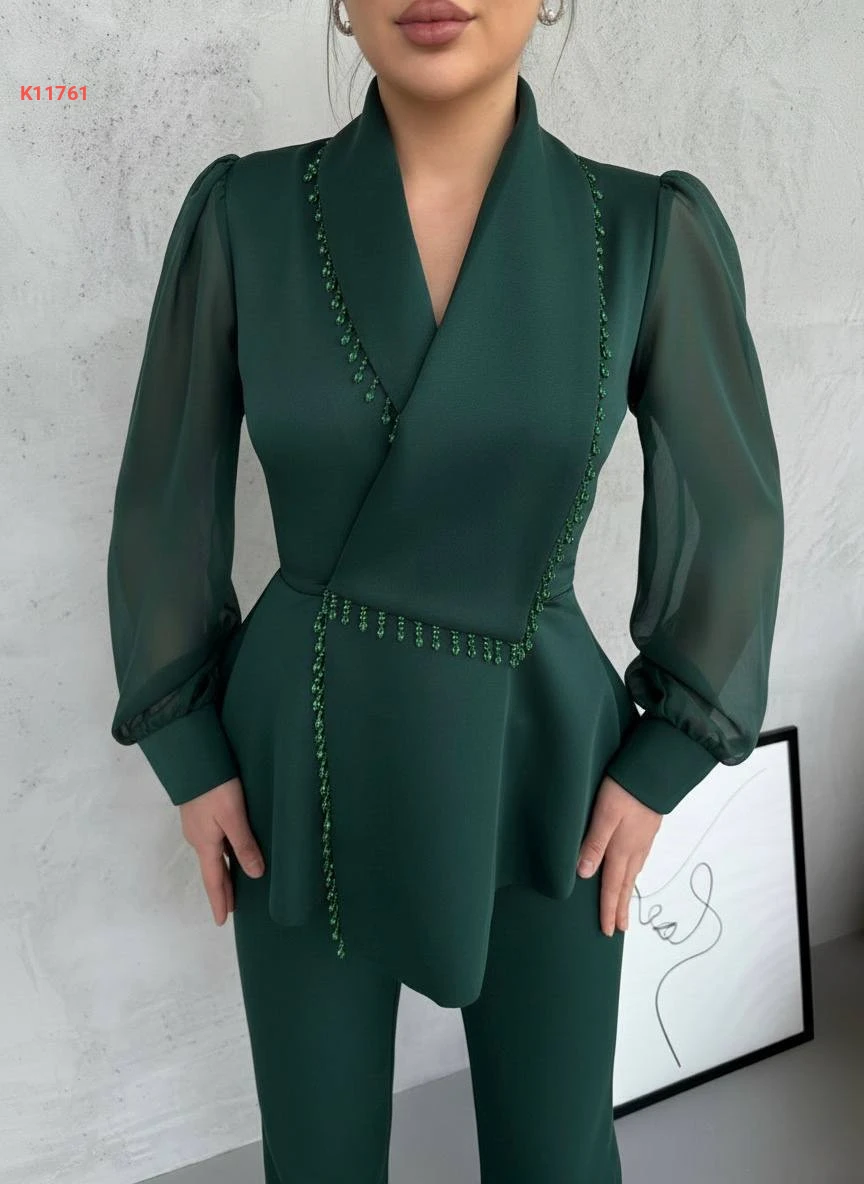 طقم بنطال وبليزر بأكمام شيفون وخرز