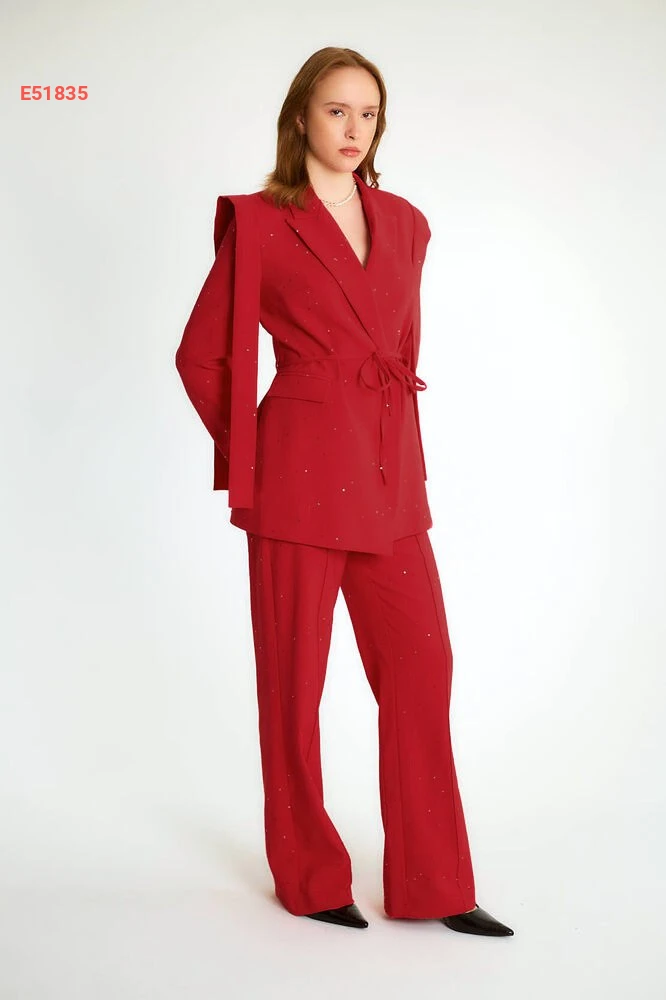 طقم بنطال حجري وجاكيت بزنار رفيع