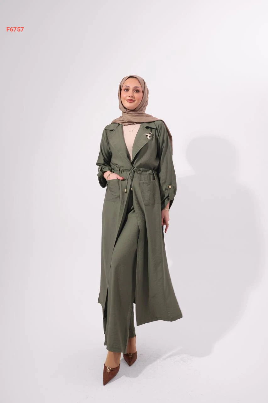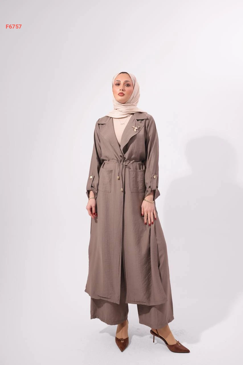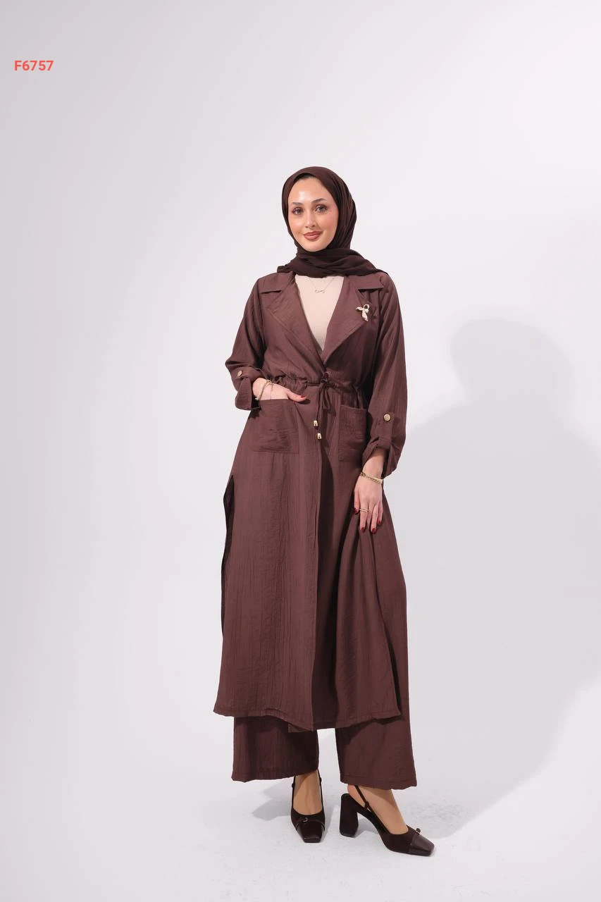 طقم بنطال وجاكيت طويل بزنار وبروش