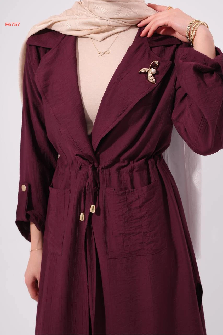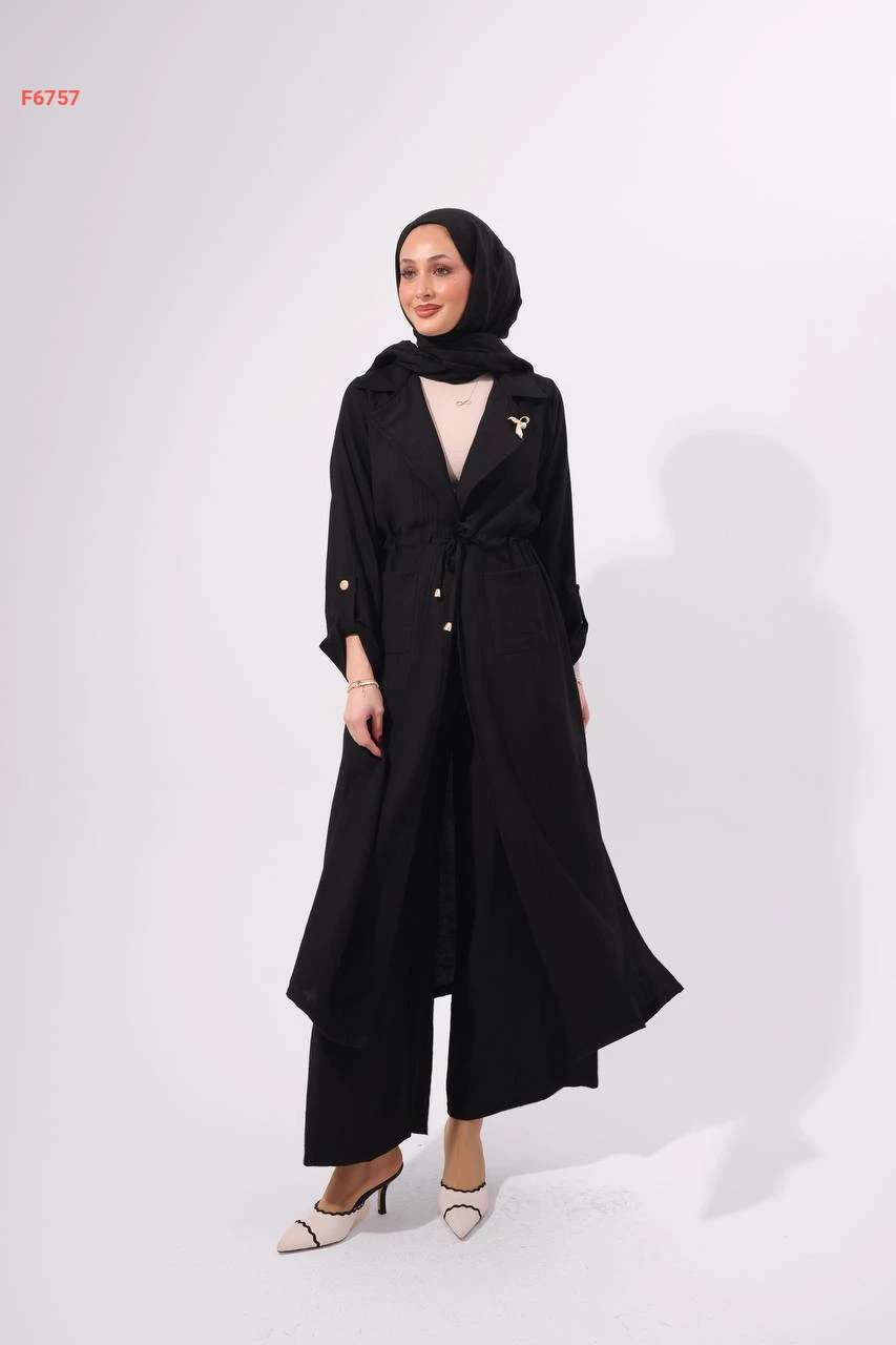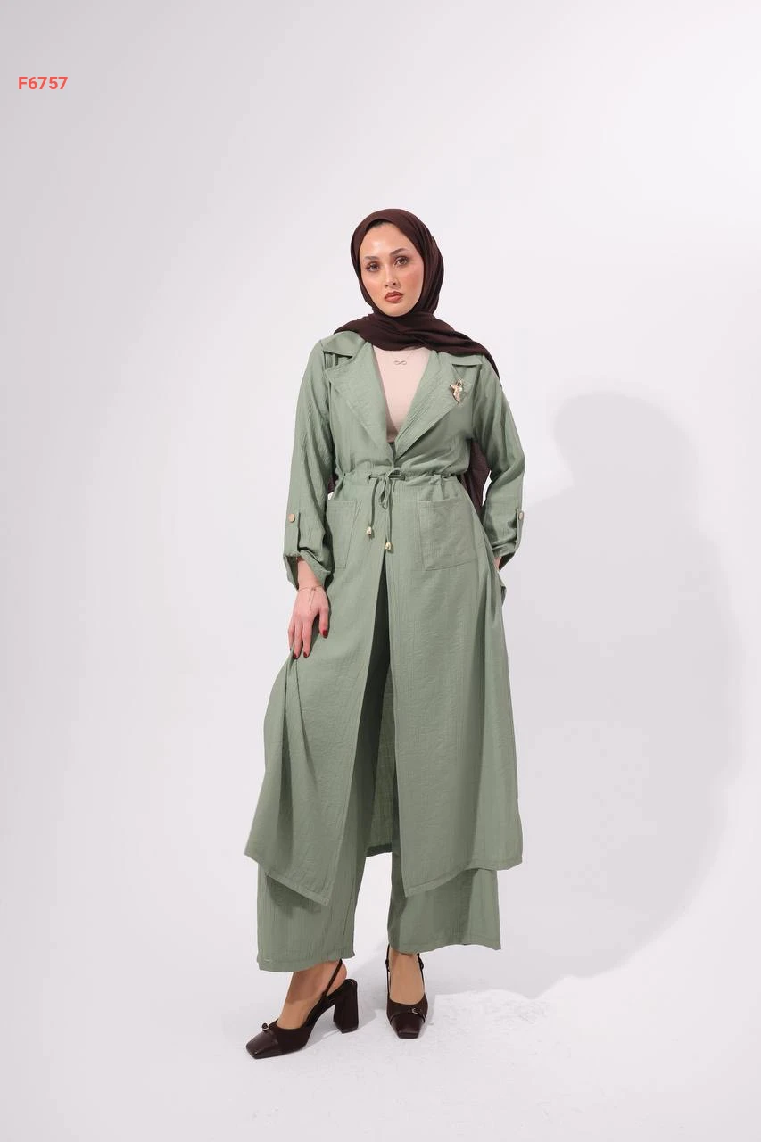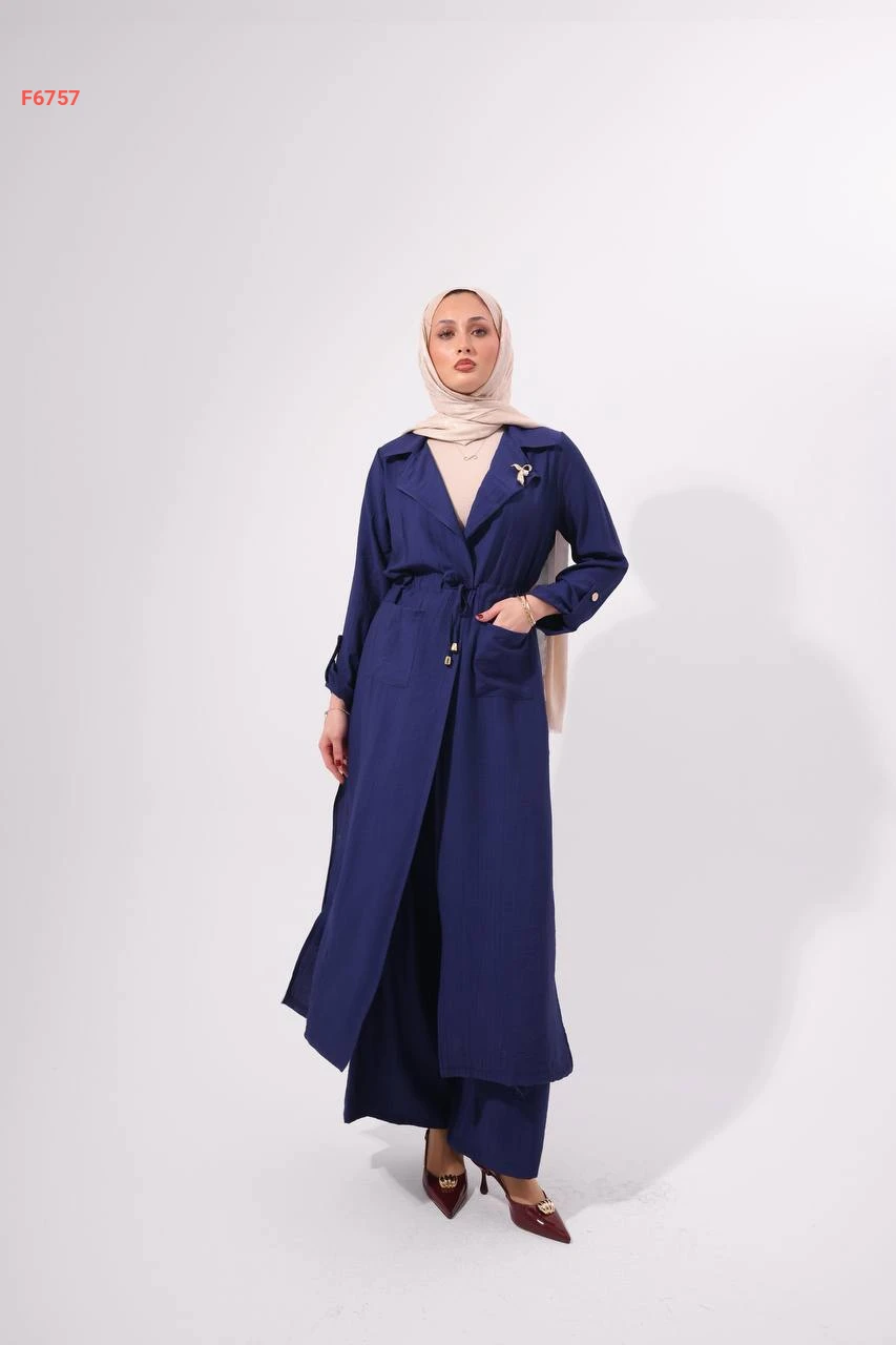 طقم بنطال وجاكيت طويل بزنار وبروش