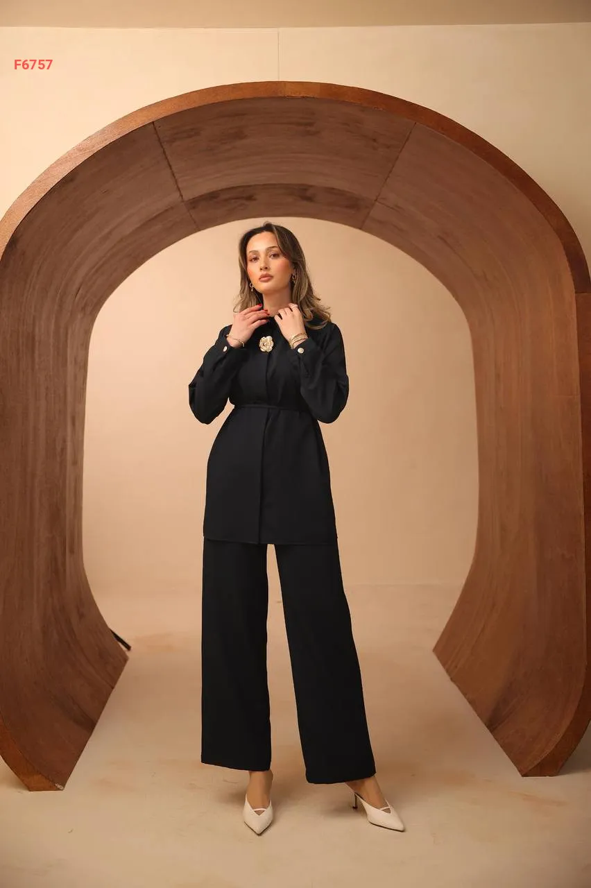 طقم بنطال وقميص بزنار وبروش دهبي